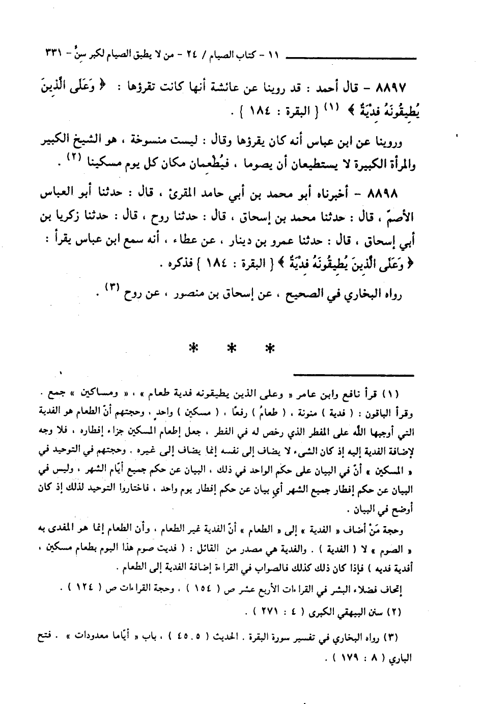 8898 - أَخْبَرَنَاهُ أَبُو مُحَمَّدِ بْنُ أَبِي حَامِدٍ الْمُقْرِئُ قَالَ: حَدَّثَنَا أَبُو الْعَبَّاسِ الْأَصَمُّ قَالَ: حَدَّثَنَا مُحَمَّدُ بْنُ إِسْحَاقَ قَالَ: حَدَّثَنَا رَوْحٌ قَالَ: حَدَّثَنَا زَكَرِيَّا بْنُ إِسْحَاقَ قَالَ: حَدَّثَنَا عَمْرُو بْنُ دِينَارٍ عَنْ عَطَاءٍ، أَنَّهُ سَمِعَ ابْنَ عَبَّاسٍ، يَقْرَأُ: {وَعَلَى الَّذِينَ يُطِيقُونَهُ فِدْيَةٌ} [البقرة: 184] فَذَكَرَهُ، رَوَاهُ الْبُخَارِيُّ فِي الصَّحِيحِ عَنْ إِسْحَاقَ بْنِ مَنْصُورٍ، عَنْ رَوْحٍ