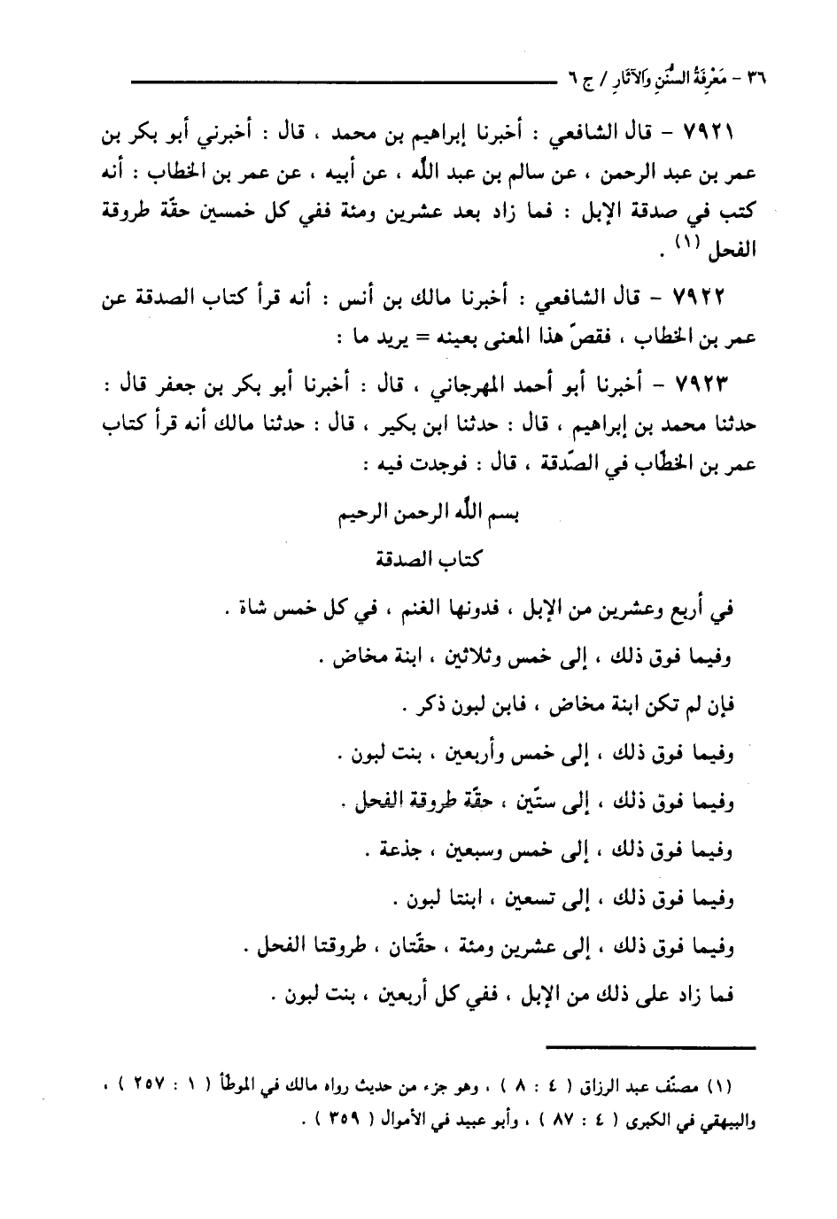 7923 - أَخْبَرَنَا أَبُو أَحْمَدَ الْمِهْرَجَانِيُّ قَالَ: أَخْبَرَنَا أَبُو بَكْرِ بْنُ جَعْفَرٍ قَالَ: حَدَّثَنَا مُحَمَّدُ بْنُ إِبْرَاهِيمَ قَالَ: حَدَّثَنَا ابْنُ بُكَيْرٍ قَالَ: حَدَّثَنَا مَالِكٌ، أَنَّهُ قَرَأَ كِتَابَ عُمَرَ بْنَ الْخَطَّابِ فِي الصَّدَقَةِ قَالَ: فَوَجَدْتُ فِيهِ: «بِسْمِ اللَّهِ الرَّحْمَنِ الرَّحِيمِ كِتَابُ الصَّدَقَةِ §فِي أَرْبَعٍ وَعِشْرِينَ مِنَ الْإِبِلِ، فَدُونَهَا الْغَنَمُ فِي كُلِّ خَمْسٍ شَاةٌ، وَفِيمَا فَوْقَ ذَلِكَ إِلَى خَمْسٍ وَثَلَاثِينَ ابْنَةُ مَخَاضٍ، فَإِنْ لَمْ تَكُنِ ابْنَةُ مَخَاضٍ، فَابْنُ لَبُونٍ ذَكَرٌ، وَفِيمَا فَوْقَ ذَلِكَ، إِلَى خَمْسٍ وَأَرْبَعِينَ، بِنْتُ لَبُونٍ، وَفِيمَا فَوْقَ ذَلِكَ إِلَى سِتِّينَ حِقَّةٌ طَرُوقَةِ الْفَحْلِ، وَفِيمَا فَوْقَ ذَلِكَ إِلَى خَمْسٍ وَسَبْعِينَ جَذَعَةٌ، وَفِيمَا فَوْقَ ذَلِكَ إِلَى تِسْعِينَ ابْنَتَا لَبُونٍ، وَفِيمَا فَوْقَ ذَلِكَ إِلَى عِشْرِينَ وَمِائَةٍ حِقَّتَانِ طَرُوقَتَا الْفَحْلِ، فَمَا زَادَ عَلَى ذَلِكَ مِنَ الْإِبِلِ فَفِي كُلِّ أَرْبَعِينَ بِنْتُ لَبُونٍ -[37]-، وَفِي كُلِّ خَمْسِينَ حِقَّةٌ ثُمَّ ذَكَرَ صَدَقَةَ الْغَنَمِ»