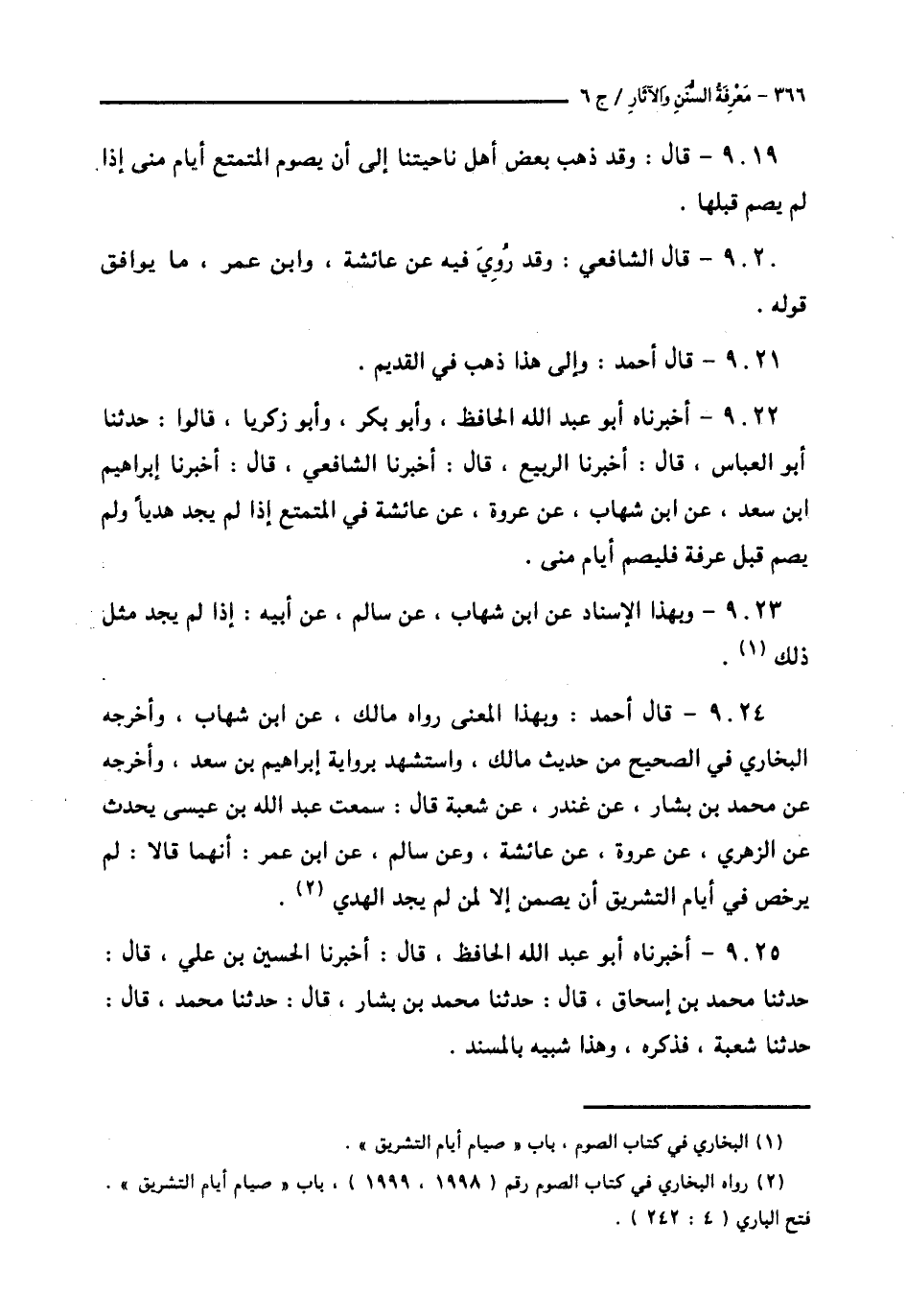 9024 - قَالَ أَحْمَدُ: وَبِهَذَا الْمَعْنَى رَوَاهُ مَالِكٌ، عَنِ ابْنِ شِهَابٍ، وَأَخْرَجَهُ الْبُخَارِيُّ فِي الصَّحِيحِ، مِنْ حَدِيثِ مَالِكٍ، وَاسْتَشْهَدَ بِرِوَايَةِ إِبْرَاهِيمَ بْنِ سَعْدٍ، وَأَخْرَجَهُ عَنْ مُحَمَّدِ بْنِ بَشَّارٍ، عَنْ غُنْدَرٍ، عَنْ شُعْبَةَ قَالَ: سَمِعْتُ عَبْدَ اللَّهِ بْنَ عِيسَى يُحَدِّثُ، عَنِ الزُّهْرِيِّ، عَنْ عُرْوَةَ، عَنْ عَائِشَةَ، وَعَنْ سَالِمٍ، عَنِ ابْنِ عُمَرَ: أَنَّهُمَا قَالَا: § «لَمْ يُرَخَّصْ فِي أَيَّامِ التَّشْرِيقِ أَنْ يُصَمْنَ إِلَّا لِمَنْ لَمْ يَجِدِ الْهَدْيَ».