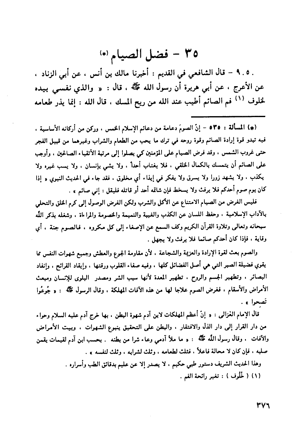9050 - قَالَ الشَّافِعِيُّ فِي الْقَدِيمِ: أَخْبَرَنَا مَالِكُ بْنُ أَنَسٍ، عَنْ أَبِي الزِّنَادٍ، عَنِ الْأَعْرَجِ، عَنْ أَبِي هُرَيْرَةَ، أَنَّ رَسُولَ اللَّهِ صَلَّى اللهُ عَلَيْهِ وَسَلَّمَ قَالَ: «وَالَّذِي نَفْسِي بِيَدِهِ §لَخُلُوفُ فَمِ الصَّائِمِ أَطْيَبُ عِنْدَ اللَّهِ مِنْ رِيحِ الْمِسْكِ» قَالَ اللَّهُ: إِنَّمَا يَذَرُ طَعَامَهُ -[377]- وَشَرَابَهُ وَشَهْوَتَهُ مِنْ أَجْلِي، فَالصِّيَامُ لِي، وَأَنَا أَجْزِي بِهِ، كُلُّ حَسَنَةٍ بِعَشْرِ أَمْثَالِهَا إِلَى سَبْعِمِائَةِ ضِعْفٍ، إِلَّا الصِّيَامَ فَهُوَ لِي، وَأَنَا أَجْزِي بِهِ "