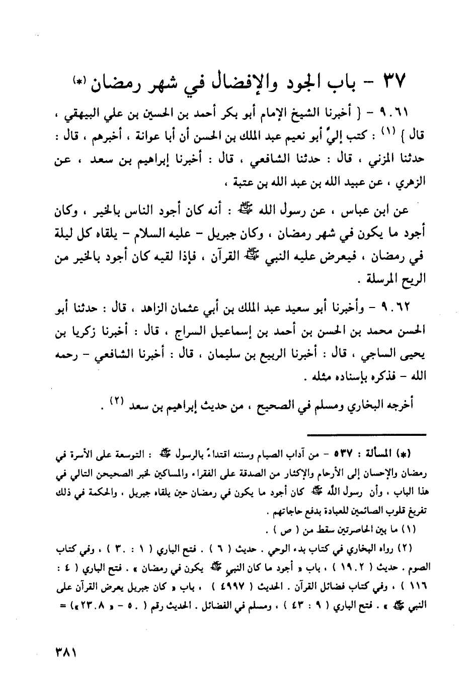 9061 - أَخْبَرَنَا الشَّيْخُ الْإِمَامُ أَبُو بَكْرٍ أَحْمَدُ بْنُ الْحُسَيْنِ بْنِ عَلِيٍّ الْبَيْهَقِيُّ قَالَ: كَتَبَ إِلَيَّ أَبُو نُعَيْمٍ عَبْدُ الْمَلِكِ بْنُ الْحَسَنِ، أَنَّ أَبَا عَوَانَةَ، أَخْبَرَهُمْ قَالَ: حَدَّثَنَا الْمُزَنِيُّ قَالَ: حَدَّثَنَا الشَّافِعِيُّ قَالَ: أَخْبَرَنَا إِبْرَاهِيمُ بْنُ سَعْدٍ، عَنِ الزُّهْرِيِّ، عَنْ عُبَيْدِ اللَّهِ بْنِ عَبْدِ اللَّهِ بْنِ عُتْبَةَ، عَنِ ابْنِ عَبَّاسٍ، عَنْ رَسُولِ اللَّهِ صَلَّى اللهُ عَلَيْهِ وَسَلَّمَ: «أَنَّهُ §كَانَ أَجْوَدَ النَّاسِ بِالْخَيْرِ، وَكَانَ أَجْوَدَ مَا يَكُونُ فِي شَهْرِ رَمَضَانَ، وَكَانَ جِبْرِيلُ عَلَيْهِ السَّلَامُ يَلْقَاهُ كُلَّ لَيْلَةٍ فِي رَمَضَانَ، فَيَعْرِضُ عَلَيْهِ النَّبِيُّ صَلَّى اللهُ عَلَيْهِ وَسَلَّمَ الْقُرْآنَ، فَإِذَا لَقِيَهُ كَانَ أَجْوَدَ بِالْخَيْرِ مِنَ الرِّيحِ الْمُرْسَلَةِ»،