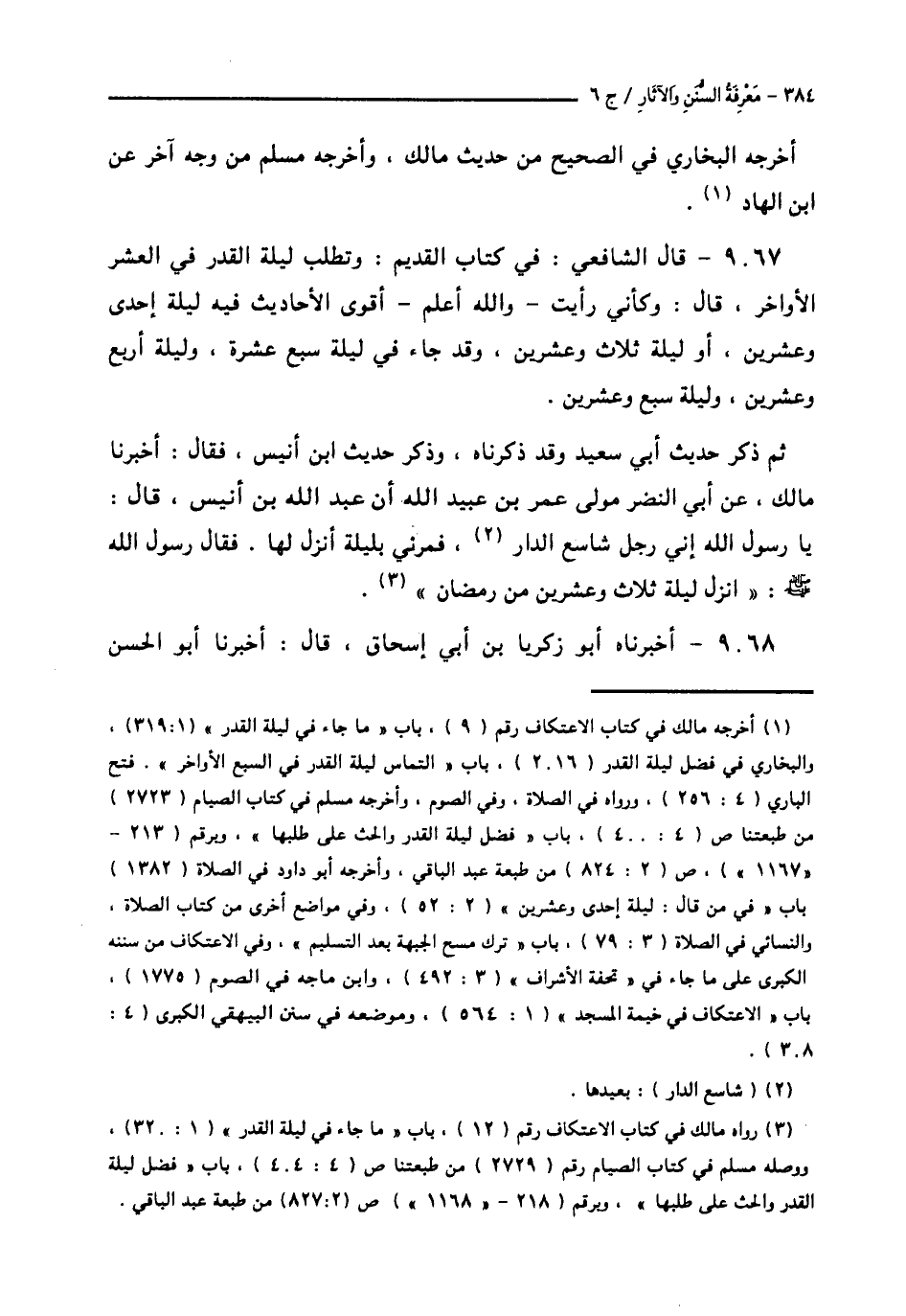 9067 - قَالَ الشَّافِعِيُّ فِي كِتَابِ الْقَدِيمِ: وَتُطْلَبُ لَيْلَةُ الْقَدْرِ فِي الْعَشْرِ الْأَوَاخِرِ قَالَ: وَكَأَنِّي رَأَيْتُ وَاللَّهُ أَعْلَمُ أَقْوَى الْأَحَادِيثِ فِيهِ لَيْلَةَ إِحْدَى وَعِشْرِينَ، أَوْ لَيْلَةَ ثَلَاثٍ وَعِشْرِينَ، وَقَدْ جَاءَ فِي لَيْلَةِ سَبْعَ عَشْرَةَ، وَلَيْلَةِ أَرْبَعٍ وَعِشْرِينَ، وَلَيْلَةِ سَبْعٍ وَعِشْرِينَ، ثُمَّ ذَكَرَ حَدِيثَ أَبِي سَعِيدٍ وَقَدْ ذَكَرْنَاهُ، وَذَكَرَ حَدِيثَ ابْنَ أُنَيْسٍ، فَقَالَ: أَخْبَرَنَا مَالِكٌ، عَنْ أَبِي النَّضْرِ مَوْلَى عُمَرَ بْنِ عُبَيْدِ اللَّهِ، أَنَّ عَبْدَ اللَّهِ بْنَ أُنَيْسٍ قَالَ: يَا رَسُولَ اللَّهِ §إِنِّي رَجُلٌ شَاسِعُ الدَّارِ، فَمُرْنِي بِلَيْلَةٍ أَنْزِلَ لَهَا، فَقَالَ رَسُولُ اللَّهِ صَلَّى اللهُ عَلَيْهِ وَسَلَّمَ: «انْزِلْ لَيْلَةَ ثَلَاثٍ وَعِشْرِينَ مِنْ رَمَضَانَ».