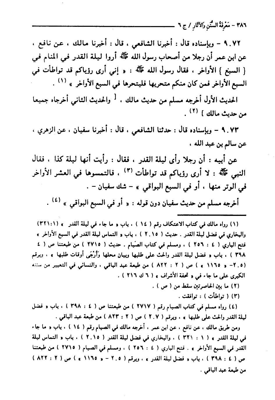 9073 - وَبِإِسْنَادِهِ قَالَ: حَدَّثَنَا الشَّافِعِيُّ قَالَ: أَخْبَرَنَا سُفْيَانُ، عَنِ الزُّهْرِيِّ، عَنْ سَالِمِ بْنِ عَبْدِ اللَّهِ، عَنْ أَبِيهِ: أَنَّ رَجُلًا رَأَى لَيْلَةَ الْقَدْرِ، فَقَالَ: رَأَيْتُ أَنَّهَا لَيْلَةَ كَذَا، فَقَالَ النَّبِيُّ صَلَّى اللهُ عَلَيْهِ وَسَلَّمَ: § «لَا أَرَى رُؤْيَاكُمْ قَدْ تَوَاطَأَتْ، فَالْتَمِسُوهَا فِي الْعَشْرِ الْأَوَاخِرِ فِي الْوِتْرِ مِنْهَا، أَوْ فِي السَّبْعِ الْبَوَاقِي»، شَكَّ سُفْيَانُ. أَخْرَجَهُ مُسْلِمٌ مِنْ حَدِيثِ سُفْيَانَ دُونَ قَوْلِهِ: «أَوْ فِي السَّبْعِ الْبَوَاقِي»