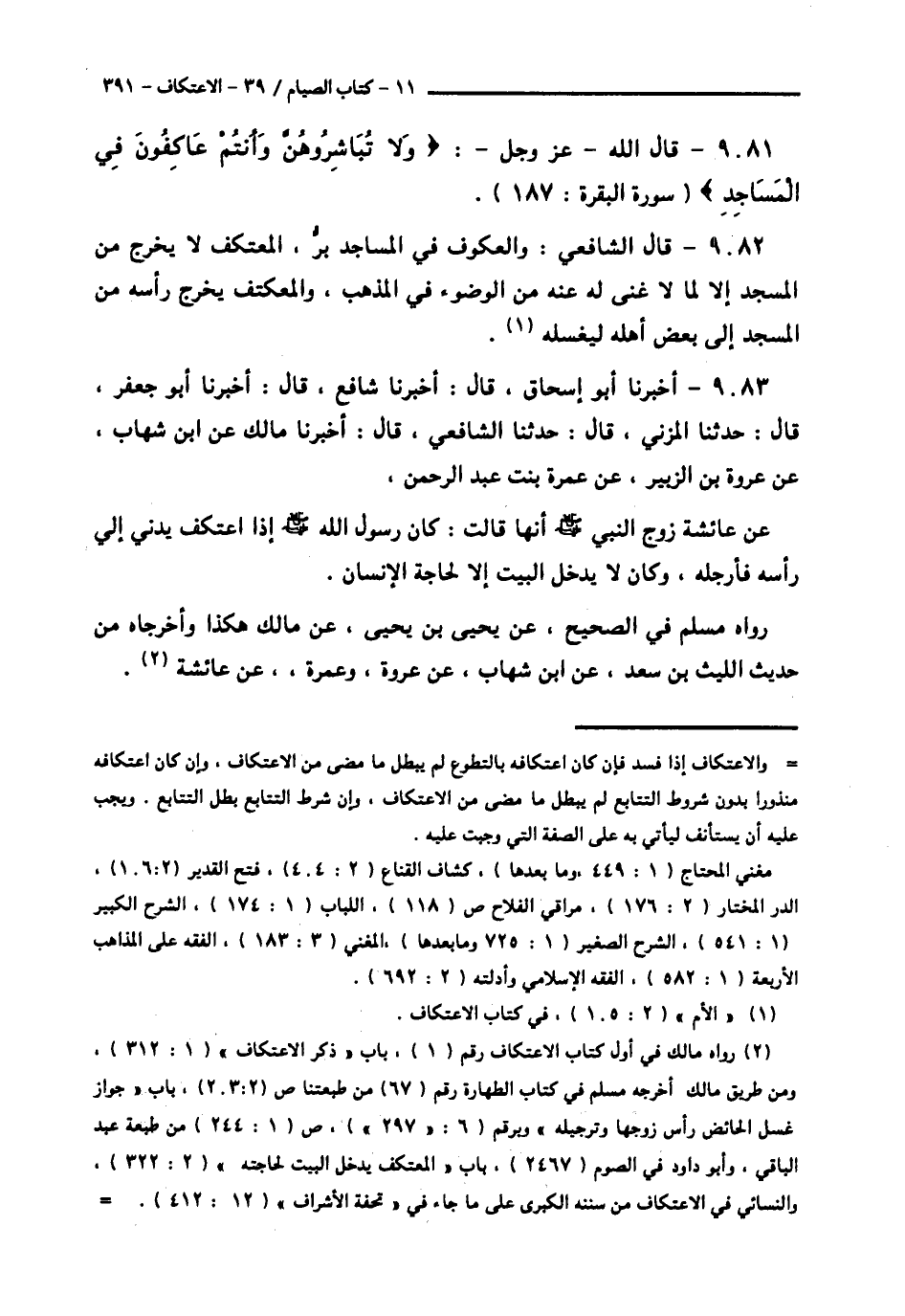 9083 - أَخْبَرَنَا أَبُو إِسْحَاقَ قَالَ: أَخْبَرَنَا شَافِعٌ قَالَ: أَخْبَرَنَا أَبُو جَعْفَرٍ قَالَ: حَدَّثَنَا الْمُزَنِيُّ قَالَ: حَدَّثَنَا الشَّافِعِيُّ قَالَ: أَخْبَرَنَا مَالِكٌ، عَنِ ابْنِ شِهَابٍ، عَنْ عُرْوَةَ بْنِ الزُّبَيْرِ، عَنْ عَمْرَةَ بِنْتِ عَبْدِ الرَّحْمَنِ، عَنْ عَائِشَةَ، زَوْجِ النَّبِيِّ صَلَّى اللهُ عَلَيْهِ وَسَلَّمَ أَنَّهَا قَالَتْ: «كَانَ §رَسُولُ اللَّهِ صَلَّى اللهُ عَلَيْهِ وَسَلَّمَ إِذَا اعْتَكَفَ يُدْنِي إِلَيَّ رَأْسَهُ فَأُرَجِّلُهُ، وَكَانَ لَا يَدْخُلُ الْبَيْتَ إِلَّا لِحَاجَةِ الْإِنْسَانِ». رَوَاهُ مُسْلِمٌ فِي الصَّحِيحِ، عَنْ يَحْيَى بْنِ يَحْيَى، عَنْ مَالِكٍ هَكَذَا، وَأَخْرَجَاهُ مِنْ حَدِيثِ اللَّيْثِ بْنِ سَعْدٍ، عَنِ ابْنِ شِهَابٍ، عَنْ عُرْوَةَ، وَعَمْرَةَ، عَنْ عَائِشَةَ