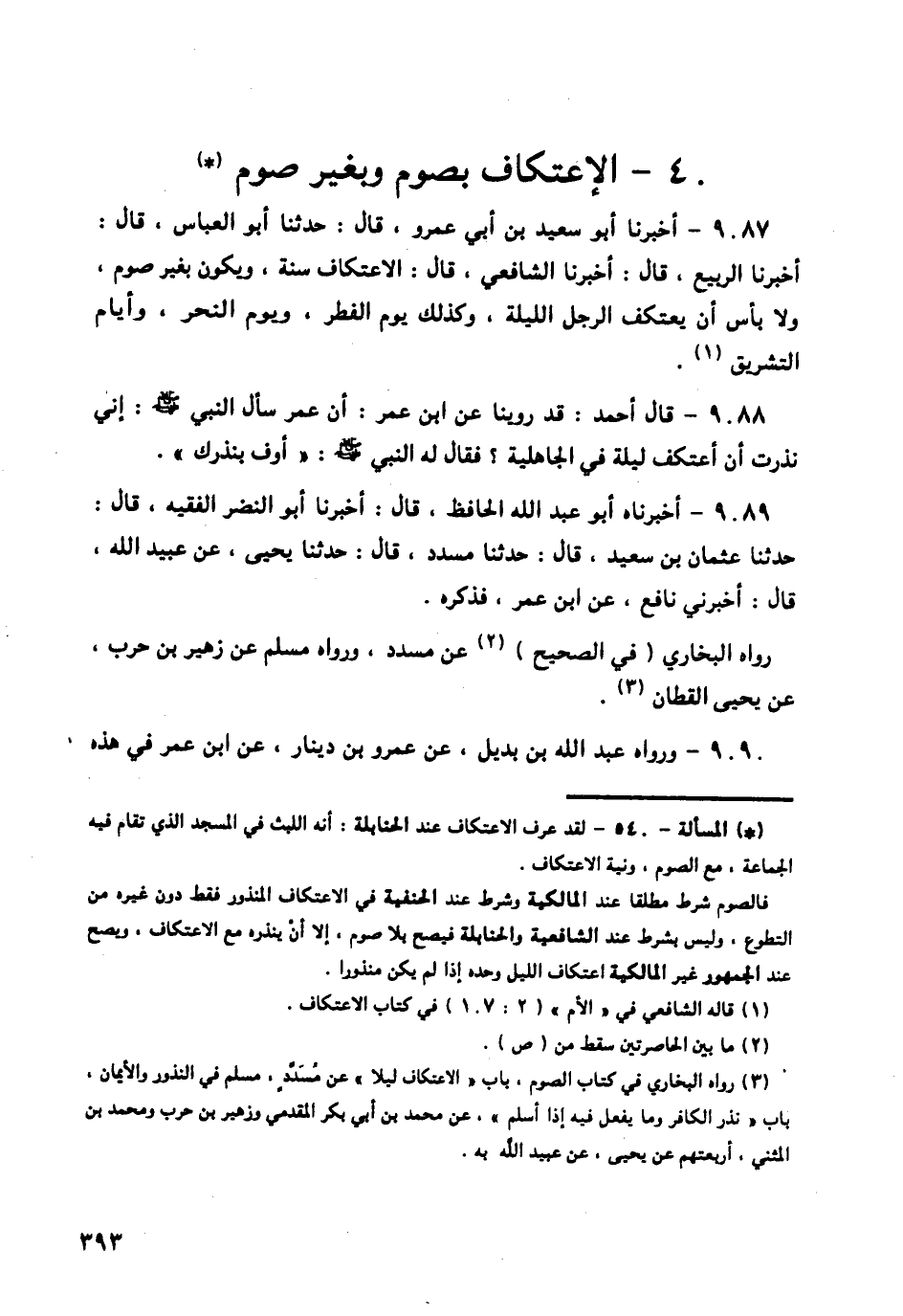 9087 - أَخْبَرَنَا أَبُو سَعِيدِ بْنُ أَبِي عَمْرٍو قَالَ: حَدَّثَنَا أَبُو الْعَبَّاسِ قَالَ: أَخْبَرَنَا الرَّبِيعُ قَالَ: أَخْبَرَنَا الشَّافِعِيُّ قَالَ: «§الِاعْتِكَافُ سُنَّةٌ، وَيَكُونُ بِغَيْرِ صَوْمٍ، وَلَا بَأْسَ أَنْ يَعْتَكِفَ الرَّجُلُ اللَّيْلَةَ، وَكَذَلِكَ يَوْمَ الْفِطْرِ، وَيَوْمَ النَّحْرِ، وَأَيَّامَ التَّشْرِيقِ»