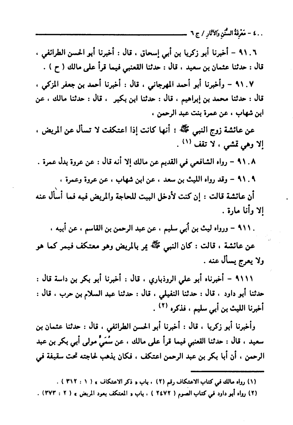 9107 - وَأَخْبَرَنَا أَبُو أَحْمَدَ الْمِهْرَجَانِيُّ قَالَ: أَخْبَرَنَا أَحْمَدُ بْنُ جَعْفَرٍ الْمُزَكِي قَالَ: حَدَّثَنَا مُحَمَّدُ بْنُ إِبْرَاهِيمَ قَالَ: حَدَّثَنَا ابْنُ بُكَيْرٍ قَالَ: حَدَّثَنَا مَالِكٌ، عَنِ ابْنِ شِهَابٍ، عَنْ عَمْرَةَ بِنْتِ عَبْدِ الرَّحْمَنِ، عَنْ عَائِشَةَ، زَوْجِ النَّبِيِّ صَلَّى اللهُ عَلَيْهِ وَسَلَّمَ: «أَنَّهَا كَانَتْ §إِذَا اعْتَكَفَتْ لَا تَسْأَلُ عَنِ الْمَرِيضِ إِلَّا وَهِيَ تَمْشِي، لَا تَقِفُ»،