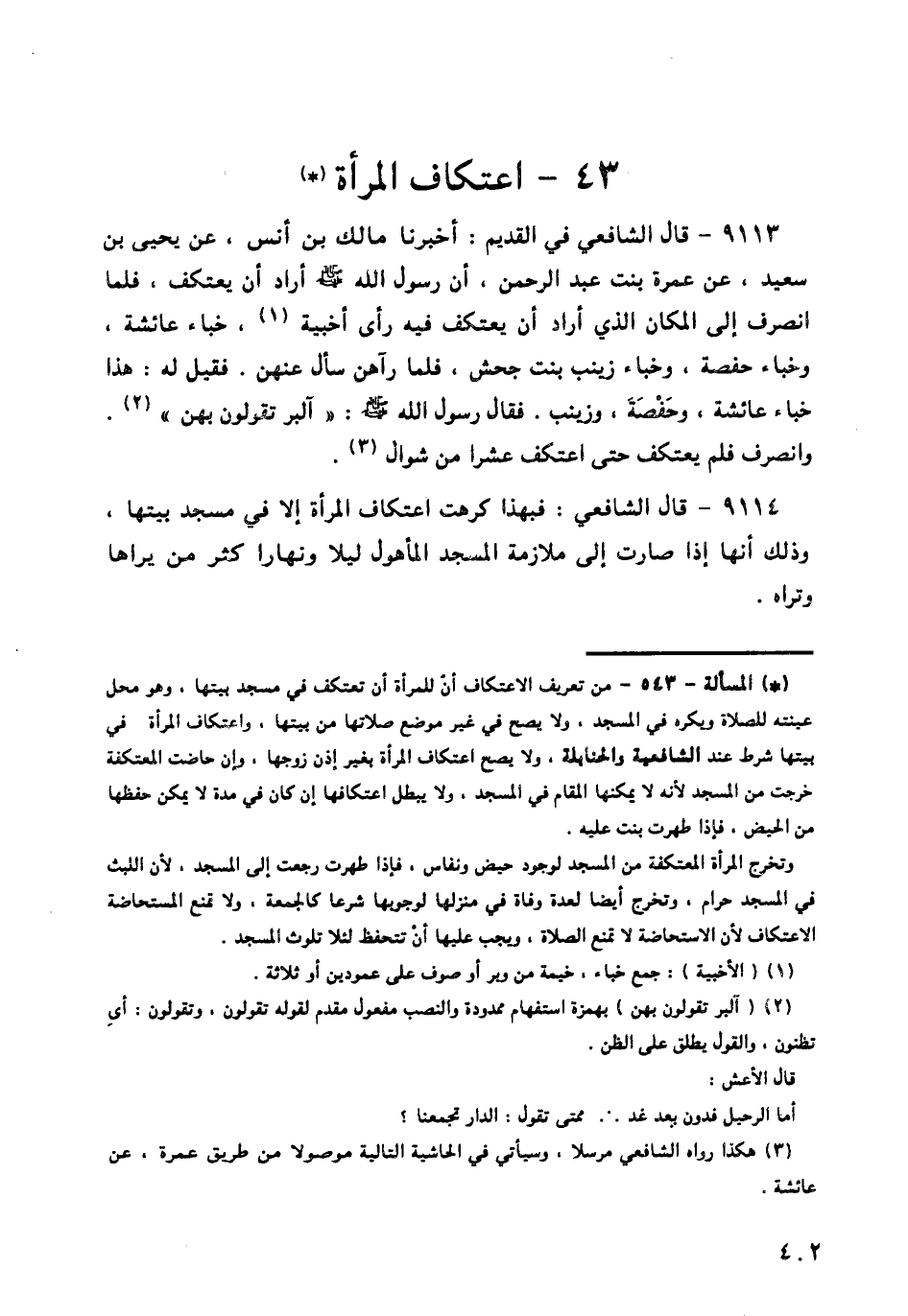 9113 - قَالَ الشَّافِعِيُّ فِي الْقَدِيمِ: أَخْبَرَنَا مَالِكُ بْنُ أَنَسٍ، عَنْ يَحْيَى بْنِ سَعِيدٍ، عَنْ عَمْرَةَ بِنْتِ عَبْدِ الرَّحْمَنِ، أَنَّ §رَسُولَ اللَّهِ صَلَّى اللهُ عَلَيْهِ وَسَلَّمَ أَرَادَ أَنْ يَعْتَكِفَ، فَلَمَّا انْصَرَفَ إِلَى الْمَكَانِ الَّذِي أَرَادَ أَنْ يَعْتَكِفَ فِيهِ رَأَى أَخْبِيَةً، خِبَاءَ عَائِشَةَ، وَخِبَاءَ حَفْصَةَ، وَخِبَاءَ زَيْنَبَ بِنْتِ جَحْشٍ، فَلَمَّا رَآهُنَّ سَأَلَ عَنْهُنَّ، فَقِيلَ لَهُ: هَذَا خِبَاءُ عَائِشَةَ، وَحَفْصَةَ، وَزَيْنَبَ، فَقَالَ رَسُولُ اللَّهِ صَلَّى اللهُ عَلَيْهِ وَسَلَّمَ: «آلْبِرَّ تَقُولُونَ بِهِنَّ»، وَانْصَرَفَ فَلَمْ يَعْتَكِفْ، حَتَّى اعْتَكَفَ عَشْرًا مِنْ شَوَّالٍ