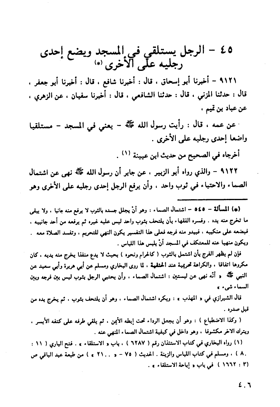 9121 - أَخْبَرَنَا أَبُو إِسْحَاقَ قَالَ: أَخْبَرَنَا شَافِعٌ قَالَ: أَخْبَرَنَا أَبُو جَعْفَرٍ قَالَ: حَدَّثَنَا الْمُزَنِيُّ قَالَ: حَدَّثَنَا الشَّافِعِيُّ قَالَ: أَخْبَرَنَا سُفْيَانُ، عَنِ الزُّهْرِيِّ، عَنْ عَبَّادِ بْنِ تَمِيمٍ، عَنْ عَمِّهِ قَالَ: «رَأَيْتُ §رَسُولَ اللَّهِ صَلَّى اللهُ عَلَيْهِ وَسَلَّمَ، يَعْنِي فِي الْمَسْجِدِ، مُسْتَلْقِيًا وَاضِعًا إِحْدَى رِجْلَيْهِ عَلَى الْأُخْرَى». أَخْرَجَاهُ فِي الصَّحِيحِ مِنْ حَدِيثِ ابْنِ عُيَيْنَةَ،