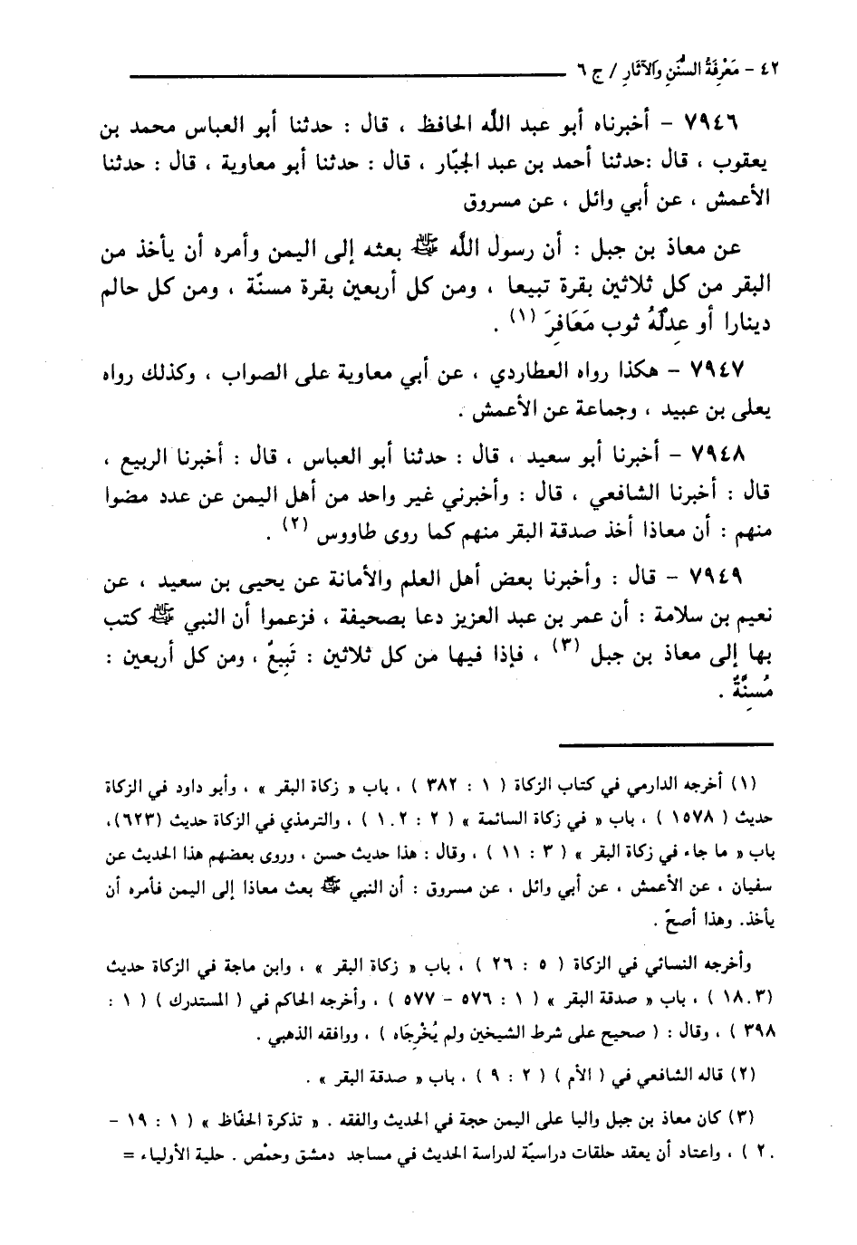 7946 - أَخْبَرَنَاهُ أَبُو عَبْدِ اللَّهِ الْحَافِظُ قَالَ: حَدَّثَنَا أَبُو الْعَبَّاسِ مُحَمَّدُ بْنُ يَعْقُوبَ قَالَ: حَدَّثَنَا أَحْمَدُ بْنُ عَبْدِ الْجَبَّارِ قَالَ: حَدَّثَنَا أَبُو مُعَاوِيَةَ قَالَ: حَدَّثَنَا الْأَعْمَشُ، عَنْ أَبِي وَائِلٍ، عَنْ مَسْرُوقٍ، عَنْ مُعَاذِ بْنِ جَبَلٍ: «أَنَّ §رَسُولَ اللَّهِ صَلَّى اللهُ عَلَيْهِ وَسَلَّمَ بَعَثَهُ إِلَى الْيَمَنِ، وَأَمَرَهُ أَنْ يَأْخُذَ مِنَ الْبَقَرِ مِنْ كُلِّ ثَلَاثِينَ بَقَرَةً تَبِيعًا، وَمَنْ كُلِّ أَرْبَعِينَ بَقَرَةً مُسِنَّةً، وَمِنْ كُلِّ حَالِمٍ دِينَارًا، أَوْ عِدْلَهُ ثَوْبَ مَعَافِرَ»،