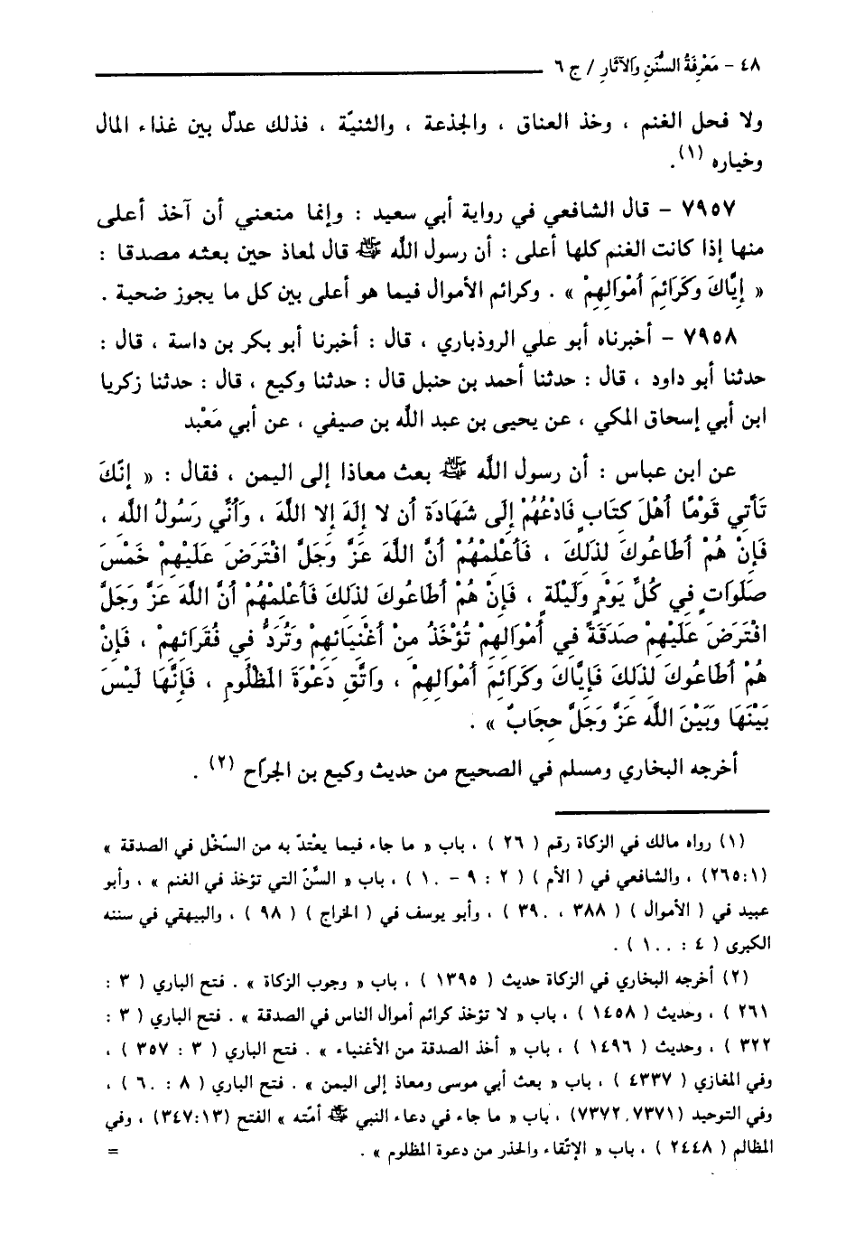 7958 - أَخْبَرَنَاهُ أَبُو عَلِيٍّ الرُّوذْبَارِيُّ قَالَ: أَخْبَرَنَا أَبُو بَكْرِ بْنُ دَاسَةَ قَالَ: حَدَّثَنَا أَبُو دَاوُدَ قَالَ: حَدَّثَنَا أَحْمَدُ بْنُ حَنْبَلٍ قَالَ: حَدَّثَنَا وَكِيعٌ قَالَ: حَدَّثَنَا زَكَرِيَّا بْنُ أَبِي إِسْحَاقَ الْمَكِّيُّ، عَنْ يَحْيَى بْنِ عَبْدِ اللَّهِ بْنِ صَيْفِيٍّ، عَنْ أَبِي مَعْبَدٍ، عَنِ ابْنِ عَبَّاسٍ: أَنَّ رَسُولَ اللَّهِ صَلَّى اللهُ عَلَيْهِ وَسَلَّمَ بَعَثَ مُعَاذًا إِلَى الْيَمَنِ، فَقَالَ: «§إِنَّكَ تَأْتِي قَوْمًا أَهْلَ كِتَابٍ، فَادْعُهُمْ إِلَى شَهَادَةِ أَنْ لَا إِلَهَ إِلَّا اللَّهُ، وَأَنِّي رَسُولُ اللَّهِ، فَإِنْ هُمْ أَطَاعُوكَ لِذَلِكَ، فَأَعْلِمْهُمْ أَنَّ اللَّهَ عَزَّ وَجَلَّ افْتَرَضَ عَلَيْهِمْ خَمْسَ صَلَوَاتٍ فِي كُلِّ يَوْمٍ وَلَيْلَةٍ، فَإِنْ هُمْ أَطَاعُوكَ لِذَلِكَ فَأَعْلِمْهُمْ أَنَّ اللَّهَ عَزَّ وَجَلَّ افْتَرَضَ عَلَيْهِمْ صَدَقَةً فِي أَمْوَالِهِمْ تُؤْخَذُ مِنْ أَغْنِيَائِهِمْ وَتُرَدُّ فِي فُقَرَائِهِمْ، فَإِنْ هُمْ أَطَاعُوكَ لِذَلِكَ فَإِيَّاكَ وَكَرَائِمَ أَمْوَالِهِمْ، وَاتَّقِ دَعْوَةَ الْمَظْلُومِ، فَإِنَّهَا لَيْسَ بَيْنَهَا وَبَيْنَ اللَّهِ عَزَّ وَجَلَّ حَجَّابٌ». أَخْرَجَهُ الْبُخَارِيُّ وَمُسْلِمٌ فِي الصَّحِيحِ مِنْ حَدِيثِ وَكِيعِ بْنِ الْجَرَّاحِ