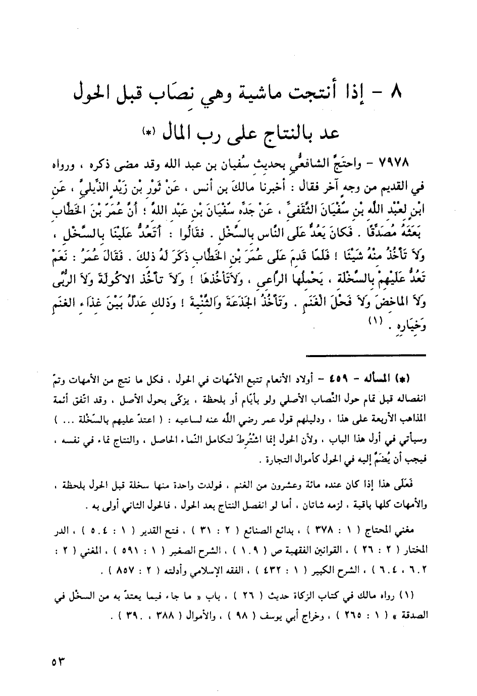 §إِذَا أَنْتَجْتَ مَاشِيَةٌ، وَهِيَ نِصَابٌ، قَبْلَ الْحَوْلِ، عُدَّ بِالنِّتَاجِ عَلَى رَبِّ الْمَالِ