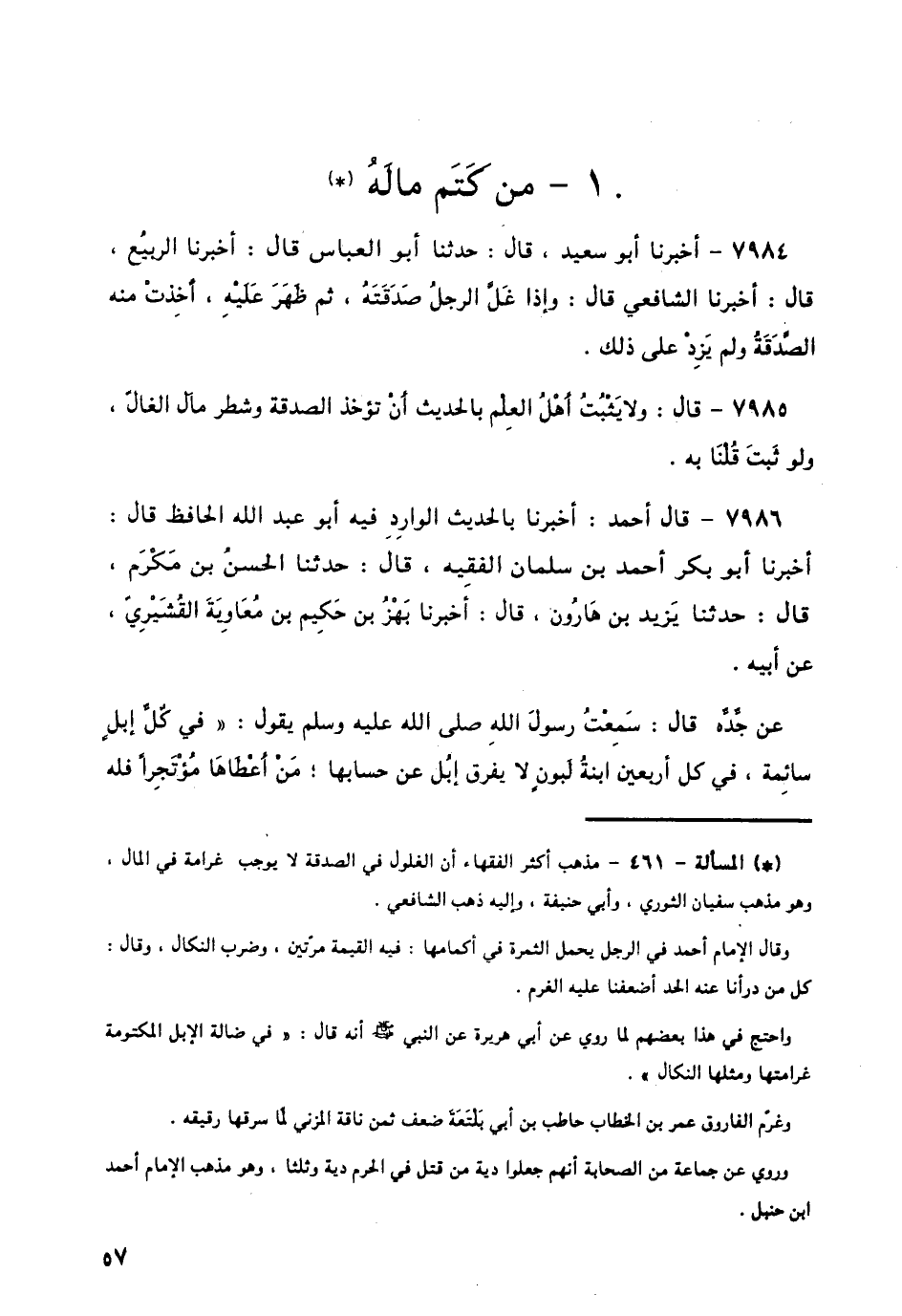 7986 - قَالَ أَحْمَدُ: أَخْبَرَنَا بِالْحَدِيثِ الْوَارِدِ فِيهِ أَبُو عَبْدِ اللَّهِ الْحَافِظُ قَالَ: أَخْبَرَنَا أَبُو بَكْرٍ أَحْمَدُ بْنُ سَلْمَانَ الْفَقِيهُ قَالَ: حَدَّثَنَا الْحَسَنُ بْنُ مُكْرَمٍ قَالَ: حَدَّثَنَا يَزِيدُ بْنُ هَارُونَ قَالَ: أَخْبَرَنَا بَهْزُ بْنُ حَكِيمِ بْنِ مُعَاوِيَةَ الْقُشَيْرِيُّ، عَنْ أَبِيهِ، عَنْ جَدِّهِ قَالَ: سَمِعْتُ رَسُولَ اللَّهِ صَلَّى اللهُ عَلَيْهِ وَسَلَّمَ، يَقُولُ: § «فِي كُلِّ إِبِلٍ سَائِمَةٍ فِي كُلِّ أَرْبَعِينَ ابْنَةُ لَبُونٍ لَا يُفَرَّقُ إِبِلٌ، عَنْ حِسَابِهَا، مِنْ أَعْطَاهَا مُؤْتَجِرًا فَلَهُ -[58]- أَجْرُهَا، وَمَنْ مَنْعَهَا فَإِنَّا آخِذُوهَا، وَشَطْرُ إِبِلِهِ عَزْمَةٌ مِنْ عَزَمَاتِ رَبِّنَا، لَا يَحِلُّ لِآلِ مُحَمَّدٍ مِنْهَا شَيْءٌ»