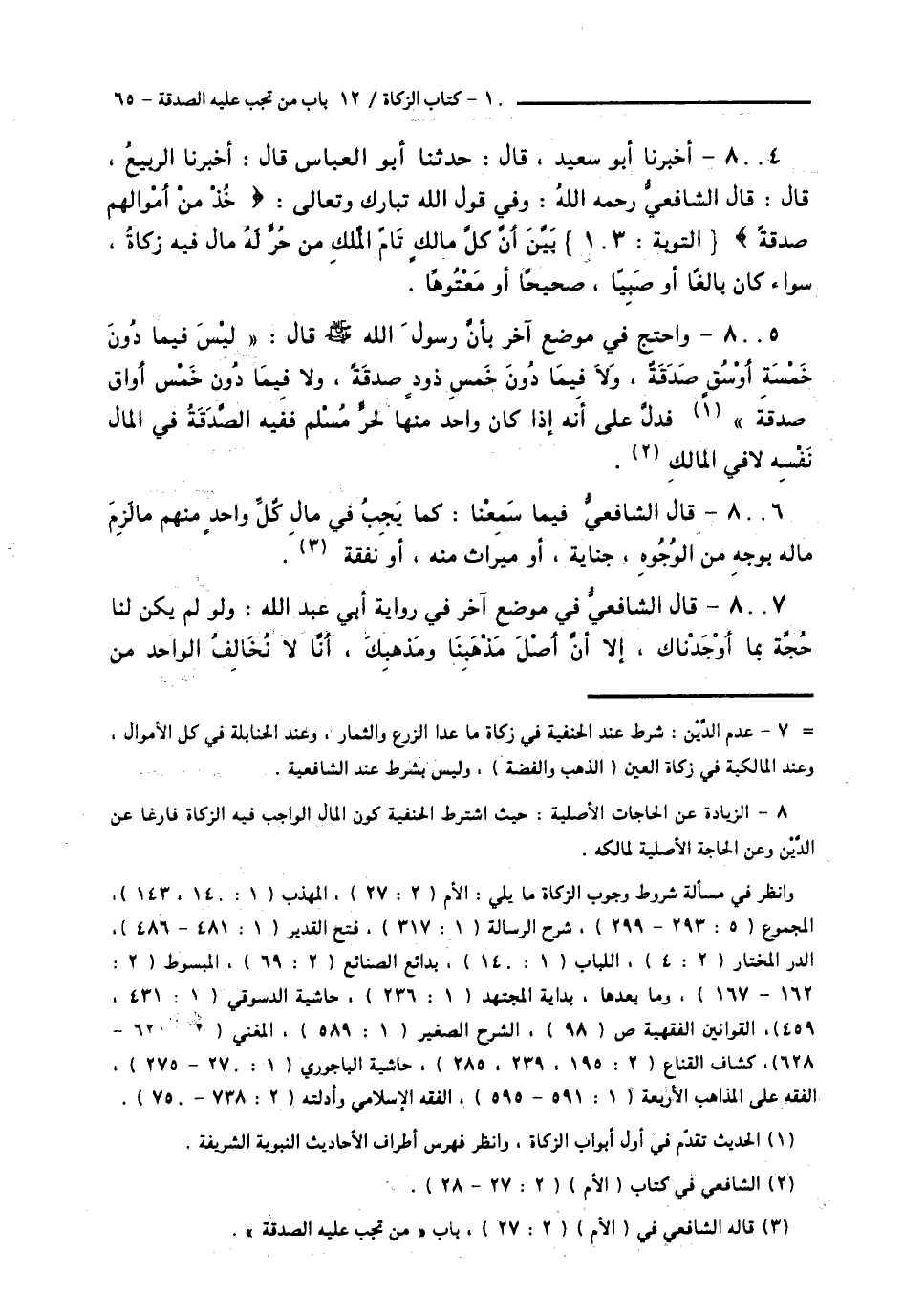 8005 - وَاحْتَجَّ فِي مَوْضِعٍ آخَرَ بِأَنَّ رَسُولَ اللَّهِ صَلَّى اللهُ عَلَيْهِ وَسَلَّمَ قَالَ: «لَيْسَ فِيمَا دُونَ خَمْسَةِ أَوْسُقٍ صَدَقَةٌ، وَلَا فِيمَا دُونَ خَمْسِ ذَوْدٍ صَدَقَةٌ، وَلَا فِيمَا دُونَ خَمْسِ أَوَاقٍ صَدَقَةٌ»، فَدَلَّ عَلَى أَنَّهُ إِذَا كَانَ وَاحِدٌ مِنْهَا لِحُرٍّ مُسْلِمٍ فَفِيهِ الصَّدَقَةُ فِي الْمَالِ نَفْسِهِ لَا فِي الْمَالِكِ