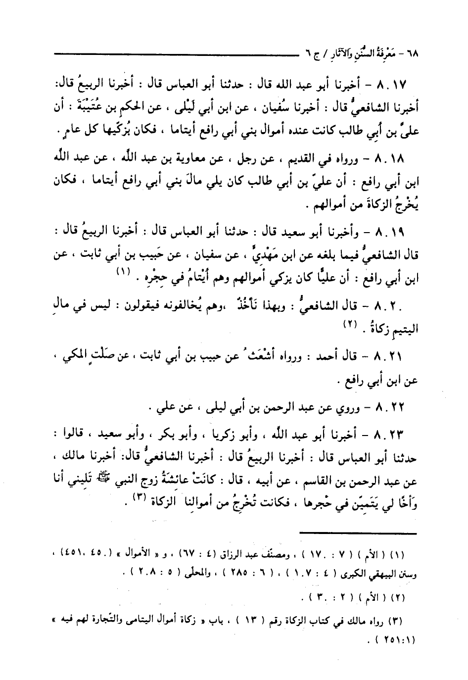 8017 - أَخْبَرَنَا أَبُو عَبْدِ اللَّهِ قَالَ: حَدَّثَنَا أَبُو الْعَبَّاسِ قَالَ: أَخْبَرَنَا الرَّبِيعُ قَالَ: أَخْبَرَنَا الشَّافِعِيُّ قَالَ: أَخْبَرَنَا سُفْيَانُ، عَنِ ابْنِ أَبِي لَيْلَى، عَنِ الْحَكَمِ بْنِ عُتَيْبَةَ: أَنَّ عَلِيَّ بْنَ أَبِي طَالِبٍ: «§كَانَتْ عِنْدَهُ أَمْوَالُ بَنِي أَبِي رَافِعٍ أَيْتَامًا، فَكَانَ يُزَكِّيهَا كُلَّ عَامٍ»،