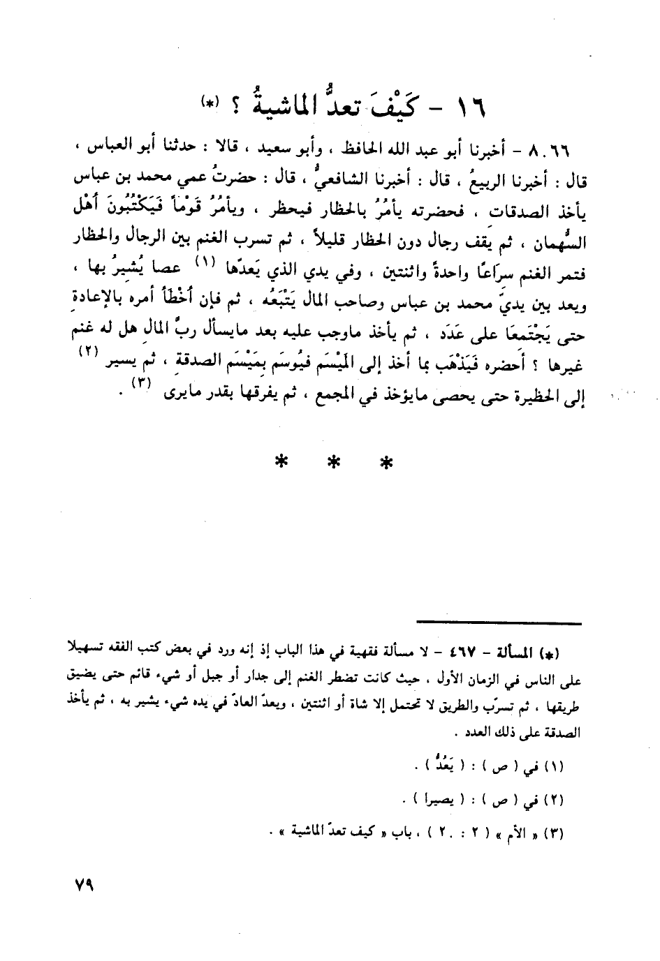 8066 - أَخْبَرَنَا أَبُو عَبْدِ اللَّهِ الْحَافِظُ، وَأَبُو سَعِيدٍ قَالَا: حَدَّثَنَا أَبُو الْعَبَّاسِ قَالَ: أَخْبَرَنَا الرَّبِيعُ قَالَ: أَخْبَرَنَا الشَّافِعِيُّ قَالَ: " حَضَرْتُ عَمِّي §مُحَمَّدَ بْنَ عَبَّاسٍ يَأْخُذُ الصَّدَقَاتِ، فَحَضَرْتُهُ يَأْمُرُ بِالْحِظَارِ فَيُحْظَرُ، وَيَأْمُرُ قَوْمًا فَيَكْتُبُونَ أَهْلَ السُّهْمَانِ، ثُمَّ يَقِفُ رِجَالٌ دُونَ الْحِظَارِ قَلِيلًا، ثُمَّ تُسَرَّبُ الْغَنَمُ بَيْنَ الرِّجَالِ وَالْحِظَارِ، فَتَمُرُّ الْغَنَمُ سِرَاعًا وَاحِدَةً وَاثْنَتَيْنِ، وَفِي يَدِيَ الَّذِي يَعُدُّهَا عَصًا يُشِيرُ بِهَا، وَيَعُدُّ بَيْنَ يَدَيَّ مُحَمَّدِ بْنِ عَبَّاسٍ، وَصَاحِبُ الْمَالِ يَتْبَعُهُ، ثُمَّ فَإِنْ أَخْطَأَ أَمَرَهُ بِالْإِعَادَةِ، حَتَّى يَجْتَمِعَا عَلَى عَدَدٍ، ثُمَّ يَأْخُذُ مَا وَجَبَ عَلَيْهِ بَعْدَ مَا يَسْأَلُ رَبَّ الْمَالِ: هَلْ لَهُ غَنَمٌّ غَيْرُهَا؟ أَحْضِرْهُ فَيَذْهَبُ بِمَا أَخَذَ إِلَى الْمِيسَمِ فَيُوسَمُ بِمَيْسَمِ الصَّدَقَةِ، ثُمَّ يَسِيرُ إِلَى الْحَظِيرَةِ، حَتَّى يُحْصِيَ مَا يُؤْخَذُ فِي الْمُجَمَّعِ، ثُمَّ يُفَرِّقُهَا بِقَدْرِ مَا يَرَى "
