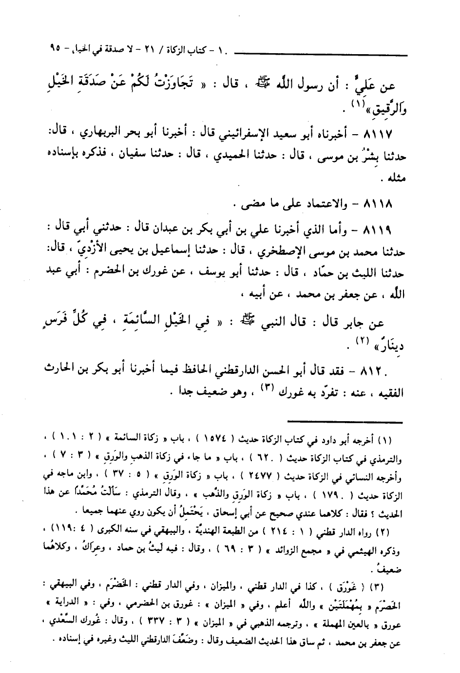 8119 - وَأَمَّا الَّذِي أَخْبَرَنَا عَلِيُّ بْنُ أَبِي بَكْرِ بْنِ عَبْدَانَ قَالَ: حَدَّثَنِي أَبِي قَالَ: حَدَّثَنَا مُحَمَّدُ بْنُ مُوسَى الْإِصْطَخْرِيُّ قَالَ: حَدَّثَنَا إِسْمَاعِيلُ بْنُ يَحْيَى الْأَزْدِيُّ قَالَ: حَدَّثَنَا اللَّيْثُ بْنُ حَمَّادٍ قَالَ: حَدَّثَنَا أَبُو يُوسُفَ، عَنْ غُورَكِ بْنِ الْحِضْرِمِ أَبِي عَبْدِ اللَّهِ، عَنْ جَعْفَرِ بْنِ مُحَمَّدٍ، عَنْ أَبِيهِ، عَنْ جَابِرٍ قَالَ: قَالَ النَّبِيُّ صَلَّى اللهُ عَلَيْهِ وَسَلَّمَ: «§فِي الْخَيْلِ السَّائِمَةِ فِي كُلِّ فَرَسٍ دِينَارٌ»،