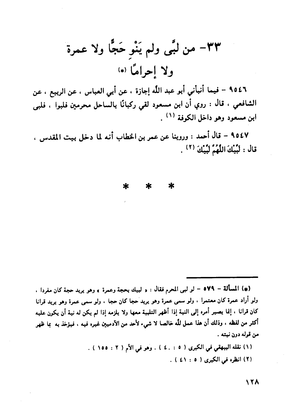 9546 - فِيمَا أَنْبَأَنِي أَبُو عَبْدِ اللَّهِ، إِجَازَةً، عَنْ أَبِي الْعَبَّاسِ، عَنِ الرَّبِيعِ، عَنِ الشَّافِعِيِّ قَالَ: رُوِيَ أَنَّ ابْنَ مَسْعُودٍ لَقِيَ رُكْبَانًا بِالسَّاحِلِ مُحْرِمِينَ فَلَبَّوْا، «§فَلَبَّى ابْنُ مَسْعُودٍ، وَهُوَ دَاخِلُ الْكُوفَةِ»