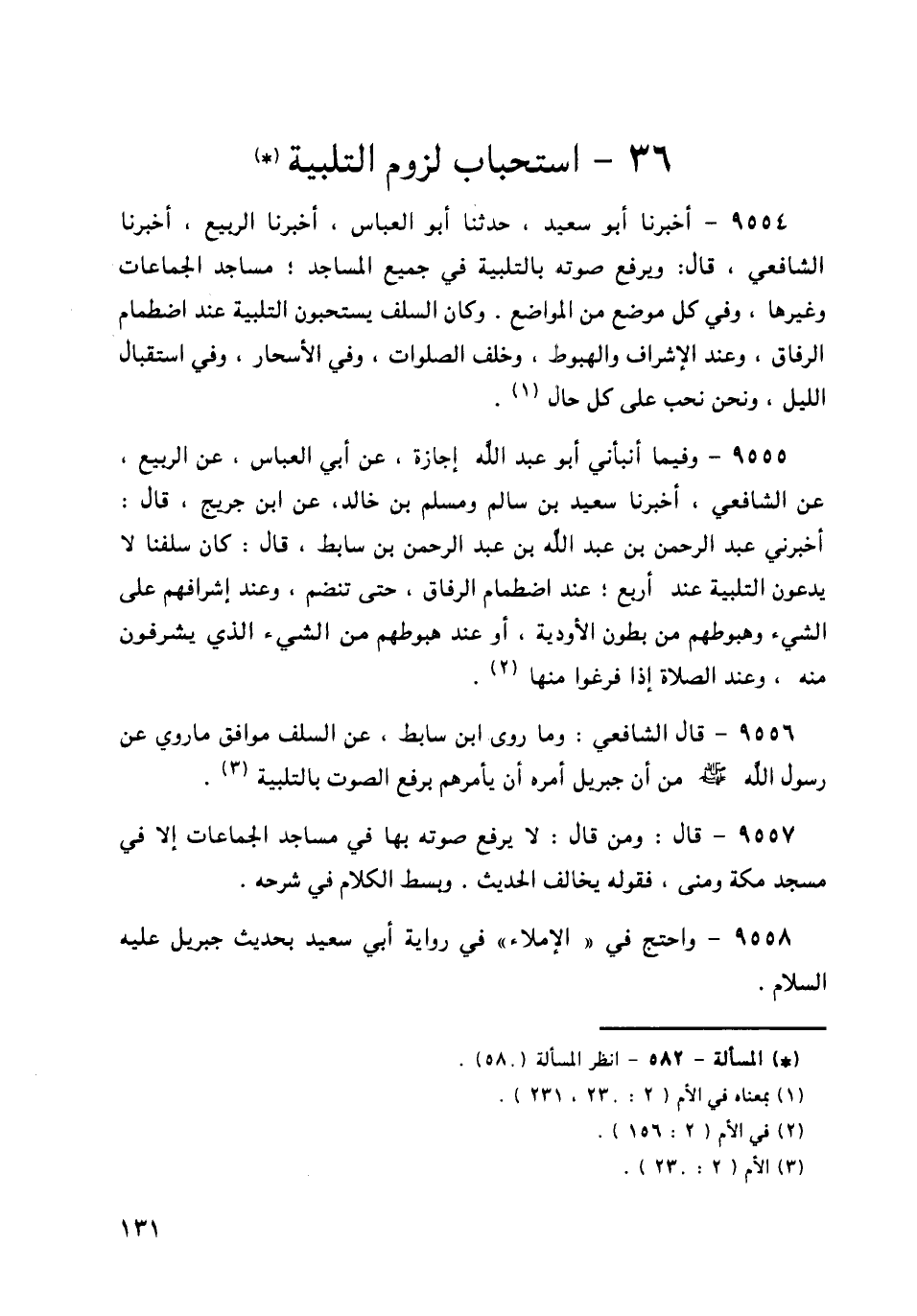 9554 - أَخْبَرَنَا أَبُو سَعِيدٍ، حَدَّثَنَا أَبُو الْعَبَّاسِ، أَخْبَرَنَا الرَّبِيعُ، أَخْبَرَنَا الشَّافِعِيُّ قَالَ: وَيَرْفَعُ صَوْتَهُ بِالتَّلْبِيَةِ فِي جَمِيعِ الْمَسَاجِدِ، مَسَاجِدِ الْجَمَاعَاتِ وَغَيْرِهَا، وَفِي كُلِّ مَوْضِعٍ مِنَ الْمَوَاضِعِ، وَكَانَ السَّلَفُ «§يَسْتَحِبُّونَ التَّلْبِيَةَ عِنْدَ اضْطِمَامِ الرِّفَاقِ، وَعِنْدَ الْإِشْرَافِ وَالْهُبُوطِ، وَخَلْفَ الصَّلَوَاتِ، وَفِي الْأَسْحَارِ، وَفِي اسْتِقْبَالِ اللَّيْلِ، وَنَحْنُ نُحِبُّ عَلَى كُلِّ حَالٍ»