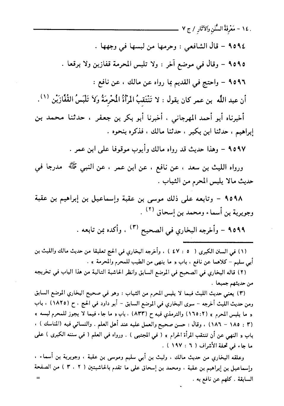9596 - وَاحْتَجَّ فِي الْقَدِيمِ بِمَا رَوَاهُ عَنْ مَالِكٍ، عَنْ نَافِعٍ، أَنَّ عَبْدَ اللَّهِ بْنَ عُمَرَ، كَانَ يَقُوَلُ: «§لَا تَنْتَقِبِ الْمَرْأَةُ الْمُحْرِمَةُ، وَلَا تَلْبَسِ الْقُفَّازَيْنِ» أَخْبَرَنَاهُ أَبُو أَحْمَدَ الْمِهْرَجَانِيُّ، أَخْبَرَنَا أَبُو بَكْرِ بْنُ جَعْفَرٍ، حَدَّثَنَا مُحَمَّدُ بْنُ إِبْرَاهِيمَ، حَدَّثَنَا ابْنُ بُكَيْرٍ، حَدَّثَنَا مَالِكٌ، فَذَكَرَهُ بِنَحْوِهِ،