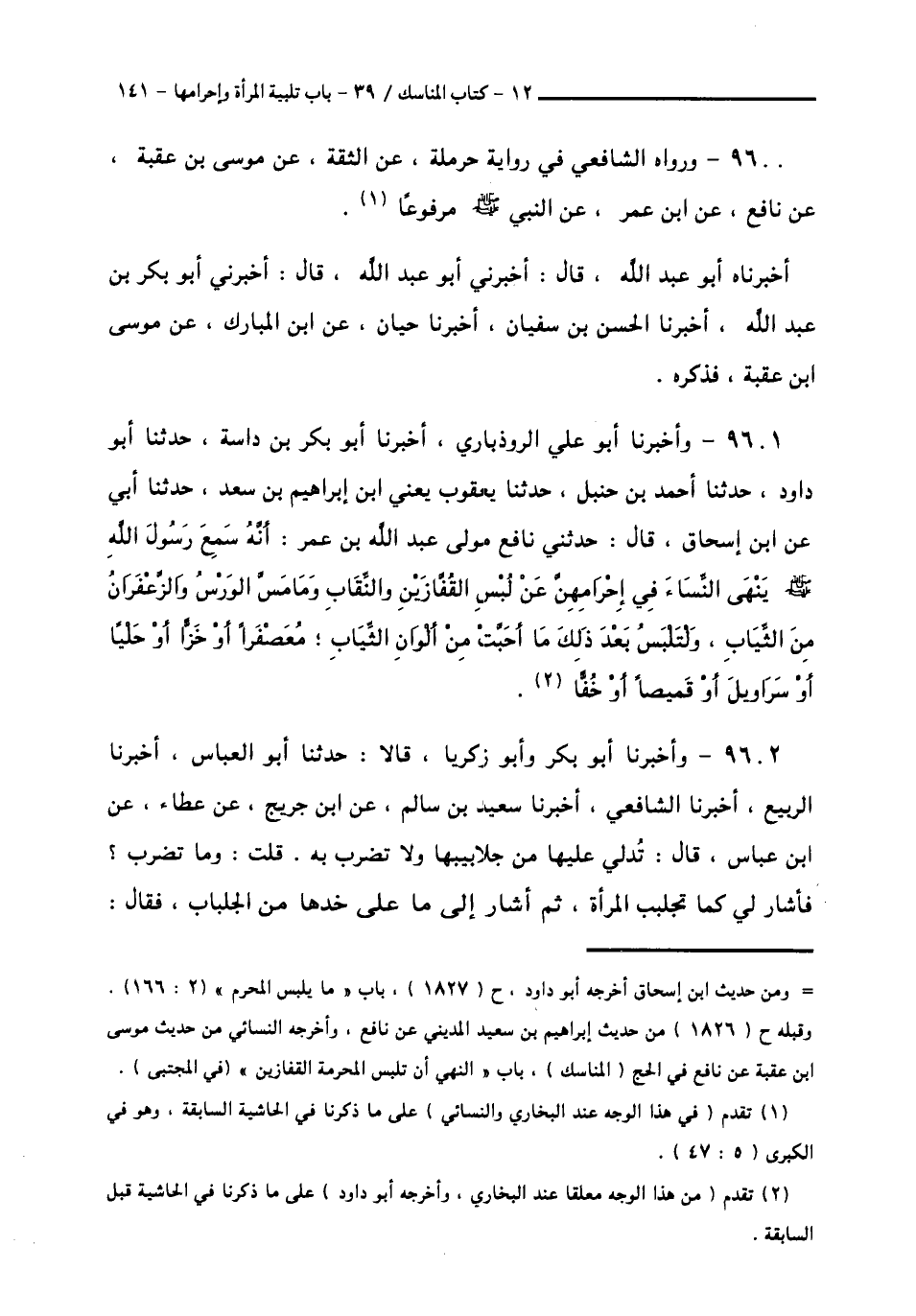 9601 - وأَخْبَرَنَا أَبُو عَلِيٍّ الرُّوذْبَارِيُّ، أَخْبَرَنَا أَبُو بَكْرِ بْنُ دَاسَةَ، حَدَّثَنَا أَبُو دَاوُدَ، حَدَّثَنَا أَحْمَدُ بْنُ حَنْبَلٍ، حَدَّثَنَا يَعْقُوبُ يَعْنِي ابْنَ إِبْرَاهِيمَ بْنِ سَعْدٍ، حَدَّثَنَا أَبِي، عَنِ ابْنِ إِسْحَاقَ قَالَ: حَدَّثَنِي نَافِعٌ، مَوْلَى عَبْدِ اللَّهِ بْنِ عُمَرَ: أَنَّهُ سَمِعَ رَسُولَ اللَّهِ صَلَّى اللهُ عَلَيْهِ وَسَلَّمَ يَنْهَى النِّسَاءَ فِي إِحْرَامِهِنَّ عَنْ «§لُبْسِ الْقُفَّازَيْنِ، وَالنِّقَابِ، وَمَا مَسَّ الْوَرْسُ وَالزَّعْفَرَانُ مِنَ الثِّيَابِ، وَلْتَلْبَسْ بَعْدَ ذَلِكَ مَا أَحَبَّتْ مِنْ أَلْوَانِ الثِّيَابِ، مُعَصْفَرًا أَوْ خَزًّا أَوْ حُلِيًّا أَوْ سَرَاوِيلَ أَوْ قَمِيصًا أَوْ خُفًّا»