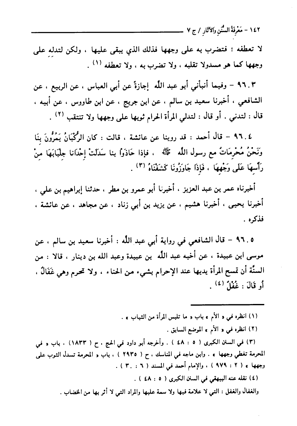 9603 - وَفِيمَا أَنْبَأَنِي أَبُو عَبْدِ اللَّهِ، إِجَازَةً عَنْ أَبِي الْعَبَّاسِ، عَنِ الرَّبِيعِ، عَنِ الشَّافِعِيِّ، أَخْبَرَنَا سَعِيدُ بْنُ سَالِمٍ، عَنِ ابْنِ جُرَيْجٍ، عَنِ ابْنِ طَاوُسٍ، عَنْ أَبِيهِ قَالَ: " §لِتُدْنِي أَوْ قَالَ: لِتُدْلِي الْمَرْأَةُ الْحَرَامُ ثَوْبَهَا عَلَى وَجْهِهَا، وَلَا تَتْنَقِبْ "