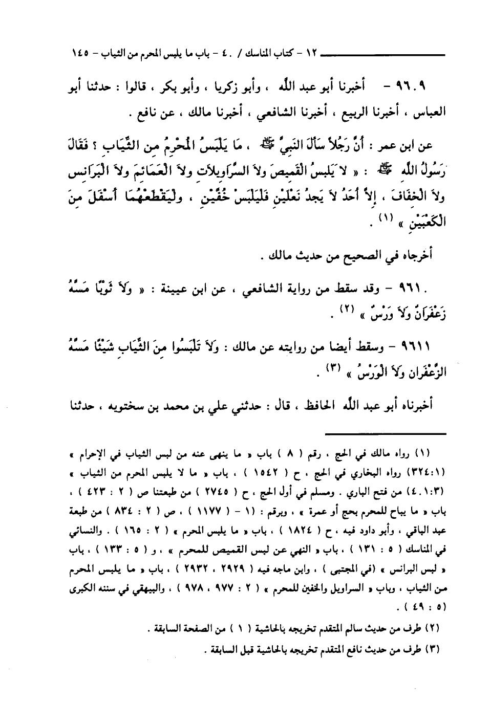 9609 - أَخْبَرَنَا أَبُو عَبْدِ اللَّهِ، وَأَبُو زَكَرِيَّا، وَأَبُو بَكْرٍ، قَالُوا: حَدَّثَنَا أَبُو الْعَبَّاسِ أَخْبَرَنَا الرَّبِيعُ أَخْبَرَنَا الشَّافِعِيُّ، أَخْبَرَنَا مَالِكٌ، عَنْ نَافِعٍ، عَنِ ابْنِ عُمَرَ: أَنَّ رَجُلًا سَأَلَ النَّبِيَّ صَلَّى اللهُ عَلَيْهِ وَسَلَّمَ مَا يَلْبَسُ الْمُحْرِمُ مِنَ الثِّيَابِ؟ فَقَالَ رَسُولُ اللَّهِ صَلَّى اللهُ عَلَيْهِ وَسَلَّمَ: «§لَا يَلْبَسُ الْقَمِيصَ، وَلَا السَّرَاوِيلَاتِ، وَلَا الْعَمَائِمَ، وَلَا الْبَرَانِسَ، وَلَا الْخِفَافَ، إِلَّا أَحَدٌ لَا يَجِدُ نَعْلَيْنِ فَلْيَلْبَسْ خُفَّيْنِ، وَلْيَقْطَعْهُمَا أَسْفَلَ مِنَ الْكَعْبَيْنِ». أَخْرَجَاهُ فِي الصَّحِيحِ مِنْ حَدِيثِ مَالِكٍ،