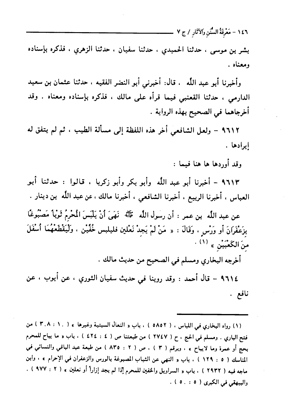 9613 - أَخْبَرَنَا أَبُو عَبْدِ اللَّهِ، وَأَبُو بَكْرٍ، وَأَبُو زَكَرِيَّا، قَالُوا: حَدَّثَنَا أَبُو الْعَبَّاسِ، أَخْبَرَنَا الرَّبِيعُ، أَخْبَرَنَا الشَّافِعِيُّ، أَخْبَرَنَا مَالِكٌ، عَنْ عَبْدِ اللَّهِ بْنِ دِينَارٍ، عَنْ عَبْدِ اللَّهِ بْنِ عُمَرَ: أَنَّ رَسُولَ اللَّهِ صَلَّى اللهُ عَلَيْهِ وَسَلَّمَ نَهَى أَنْ " §يَلْبَسَ الْمُحْرِمُ ثَوْبًا مَصْبُوغًا بِزَعْفَرَانٍ أَوْ وَرْسٍ، وَقَالَ: «مَنْ لَمْ يَجِدْ نَعْلَيْنِ فَلْيَلْبَسْ خُفَّيْنِ، وَلْيَقْطَعْهُمَا أَسْفَلَ مِنَ الْكَعْبَيْنِ». أَخْرَجَهُ الْبُخَارِيُّ، وَمُسْلِمٌ فِي الصَّحِيحِ مِنْ حَدِيثِ مَالِكٍ