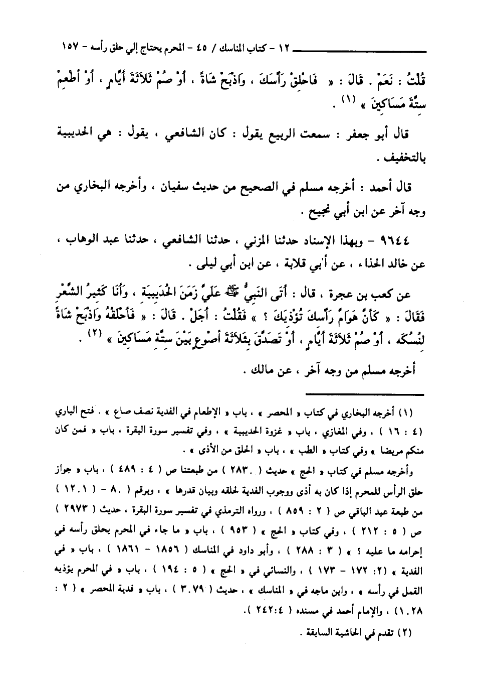 9644 - وَبِهَذَا الْإِسْنَادِ حَدَّثَنَا الْمُزَنِيُّ، حَدَّثَنَا الشَّافِعِيُّ، حَدَّثَنَا عَبْدُ الْوَهَّابِ، عَنْ خَالِدٍ الْحَذَّاءِ، عَنْ أَبِي قِلَابَةَ، عَنِ ابْنِ أَبِي لَيْلَى، عَنْ كَعْبِ بْنِ عُجْرَةَ قَالَ: أَتَى النَّبِيُّ صَلَّى اللهُ عَلَيْهِ وَسَلَّمَ عَلَيَّ زَمَنَ الْحُدَيْبِيَةِ، وَأَنَا كَثِيرُ الشَّعْرِ، فَقَالَ: «كَأَنَّ هَوَامَّ رَأْسِكَ تُؤْذِيكَ؟» فَقُلْتُ: أَجَلْ قَالَ: «§فَاحْلِقْهُ وَاذْبَحْ شَاةً لِنُسُكِهِ، أَوْ صُمْ ثَلَاثَةَ أَيَّامٍ، أَوْ تَصَدَّقْ بِثَلَاثَةِ أَصْوُعٍ بَيْنَ سِتَّةِ مَسَاكِينَ» أَخْرَجَهُ مُسْلِمٌ مِنْ وَجْهٍ آخَرَ، عَنْ مَالِكٍ