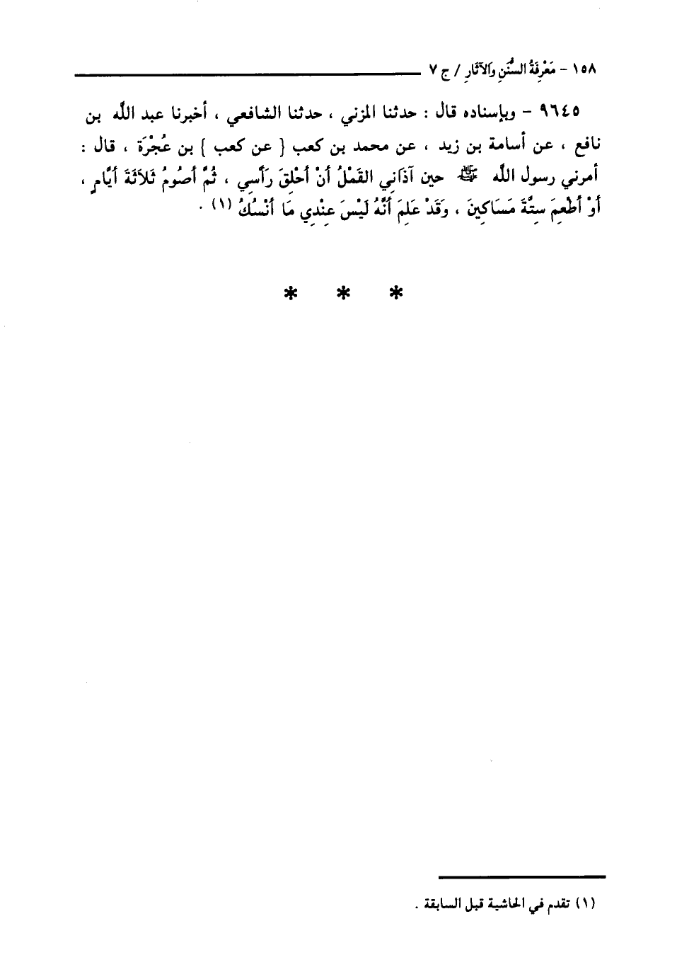 9645 - وَبِإِسْنَادِهِ قَالَ: حَدَّثَنَا الْمُزَنِيُّ، حَدَّثَنَا الشَّافِعِيُّ، أَخْبَرَنَا عَبْدُ اللَّهِ بْنُ نَافِعٍ، عَنْ أُسَامَةَ بْنِ زَيْدٍ، عَنْ مُحَمَّدِ بْنِ كَعْبٍ، عَنْ كَعْبِ بْنِ عُجْرَةَ قَالَ: أَمَرَنِي رَسُولُ اللَّهِ صَلَّى اللهُ عَلَيْهِ وَسَلَّمَ حِينَ آذَانِي الْقَمْلُ أَنْ «§أَحْلِقَ رَأْسِي، ثُمَّ أَصُومَ ثَلَاثَةَ أَيَّامٍ، أَوْ أُطْعِمَ سِتَّةَ مَسَاكِينَ، وَقَدْ عَلِمَ أَنَّهُ لَيْسَ عِنْدِي مَا أُنْسِكُ»