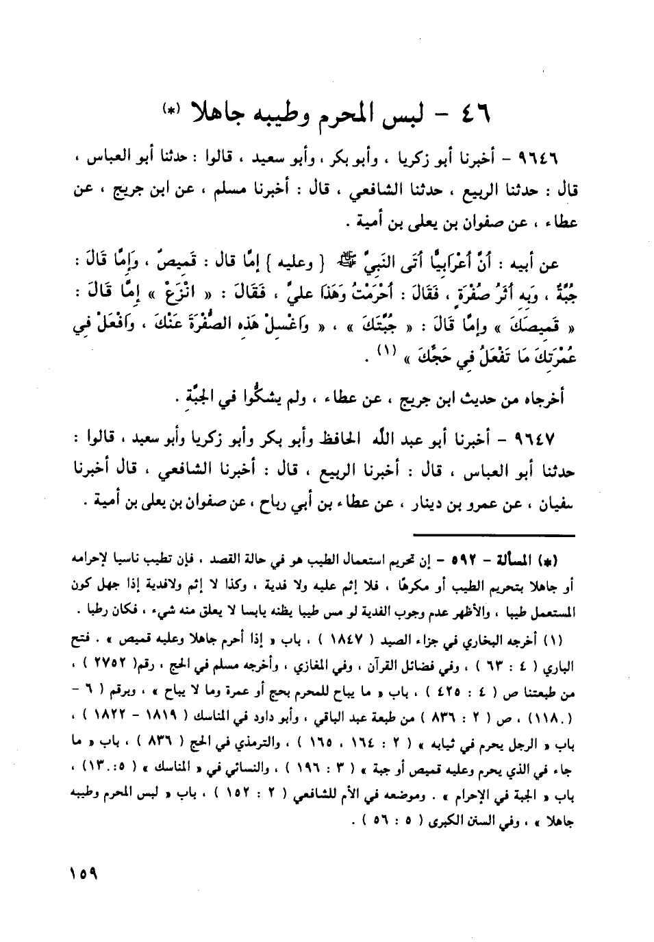 9646 - أَخْبَرَنَا أَبُو زَكَرِيَّا، وَأَبُو بَكْرٍ، وَأَبُو سَعِيدٍ، قَالُوا: حَدَّثَنَا أَبُو الْعَبَّاسِ قَالَ: حَدَّثَنَا الرَّبِيعُ، حَدَّثَنَا الشَّافِعِيُّ قَالَ: أَخْبَرَنَا مُسْلِمٌ، عَنِ ابْنِ جُرَيْجٍ، عَنْ عَطَاءٍ، عَنْ صَفْوَانَ بْنِ يَعْلَى بْنِ أُمَيَّةَ، عَنْ أَبِيهِ: أَنَّ أَعْرَابِيًّا أَتَى النَّبِيَّ صَلَّى اللهُ عَلَيْهِ وَسَلَّمَ، وَعَلَيْهِ إِمَّا قَالَ: قَمِيصٌ، وَإِمَّا قَالَ: جُبَّةٌ، وَبِهِ أَثَرُ صُفْرَةٍ، فَقَالَ: " §أَحْرَمْتُ وَهَذَا عَلَيَّ، فَقَالَ: «انْزِعْ»، إِمَّا قَالَ: «قَمِيصَكَ»، وَإِمَّا قَالَ: «جُبَّتَكَ»، «وَاغْسِلْ هَذِهِ الصُّفْرَةَ عَنْكَ، وَافْعَلْ فِي عُمْرَتِكَ مَا تَفْعَلُ فِي حَجِّكَ» أَخْرَجَاهُ مِنْ حَدِيثِ ابْنِ جُرَيْجٍ، عَنْ عَطَاءٍ، وَلَمْ يَشُكُّوا فِي الْجُبَّةِ