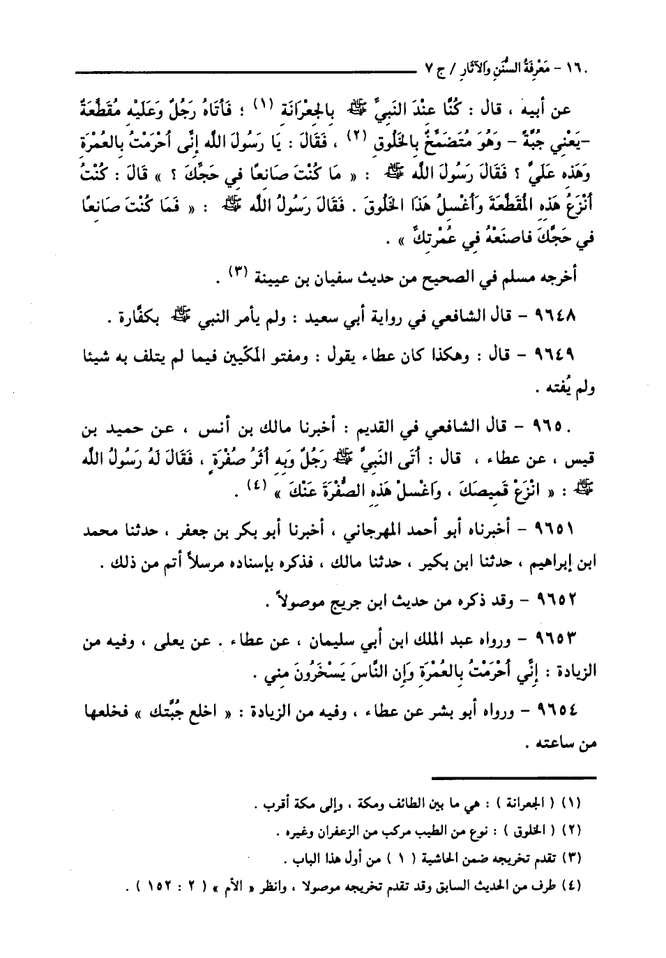 9653 - وَرَوَاهُ عَبْدُ الْمَلِكِ بْنُ أَبِي سُلَيْمَانَ، عَنْ عَطَاءٍ، عَنْ يَعْلَى وَفِيهِ مِنَ الزِّيَادَةِ: إِنِّي أَحْرَمْتُ بِالْعُمْرَةِ، وَإِنَّ النَّاسَ يَسْخَرُونَ مِنِّي،