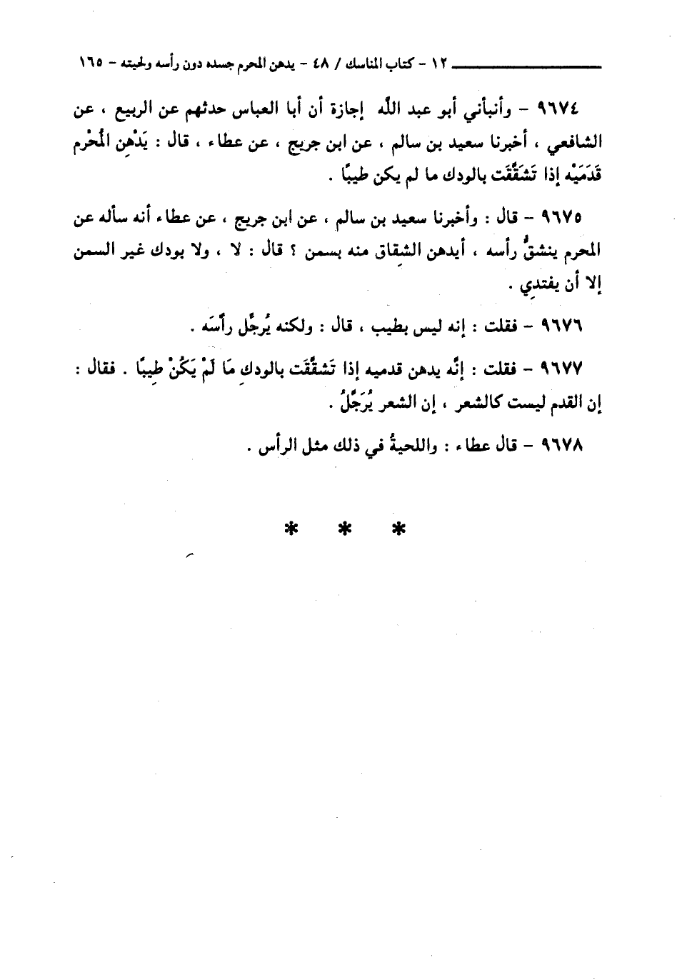 9677 - فَقُلْتُ: إِنَّهُ يَدْهِنُ قَدَمَيْهِ إِذَا تَشَقَّقَتْ بِالْوَدَكِ مَا لَمْ يَكُنْ طِيبًا. فَقَالَ: إِنَّ الْقَدَمَ لَيْسَتْ كَالشَّعْرِ، إِنَّ الشَّعْرَ يُرَجَّلُ