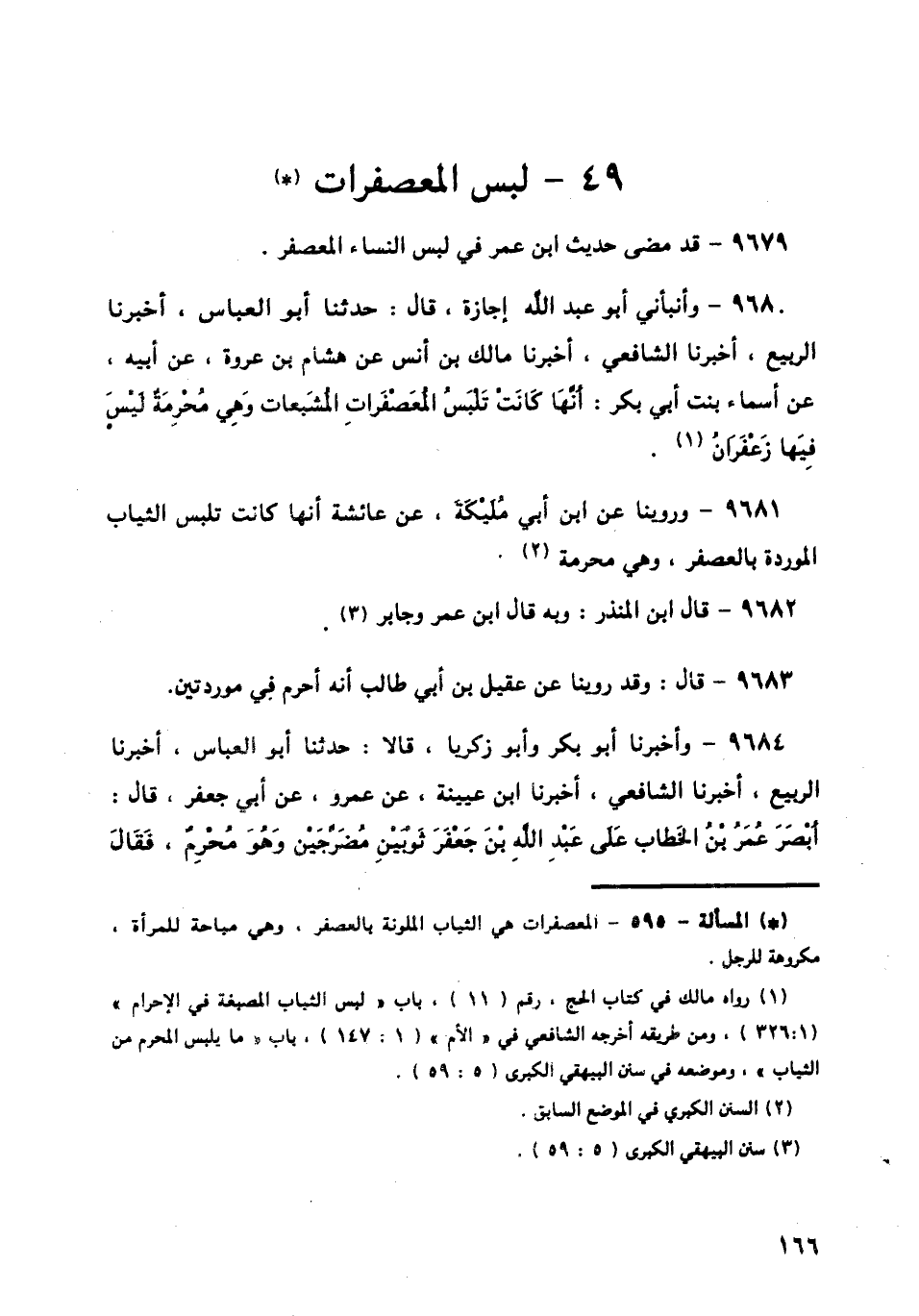 9680 - وأَنْبَأَنِي أَبُو عَبْدِ اللَّهِ، إِجَازَةً قَالَ: حَدَّثَنَا أَبُو الْعَبَّاسِ، أَخْبَرَنَا الرَّبِيعُ، أَخْبَرَنَا الشَّافِعِيُّ، أَخْبَرَنَا مَالِكُ بْنُ أَنَسٍ، عَنْ هِشَامِ بْنِ عُرْوَةَ، عَنْ أَبِيهِ، عَنْ أَسْمَاءَ بِنْتِ أَبِي بَكْرٍ: أَنَّهَا كَانَتْ § «تَلْبَسُ الْمُعَصْفَرَاتِ الْمُشَبَّعَاتِ، وَهِيَ مُحْرِمَةٌ لَيْسَ فِيهَا زَعْفَرَانٌ»