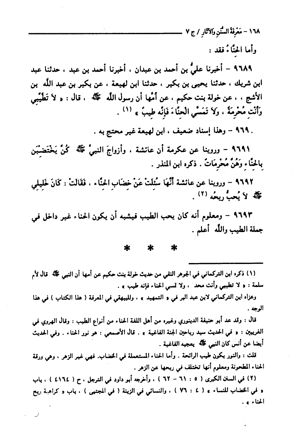 9692 - وَرُوِّينَا عَنْ عَائِشَةَ، أَنَّهَا سُئِلَتْ عَنْ خِضَابِ الْحِنَّاءِ، فَقَالَتْ: كَانَ خَلِيلِي صَلَّى اللهُ عَلَيْهِ وَسَلَّمَ «لَا يُحِبُّ رِيحَهُ»،