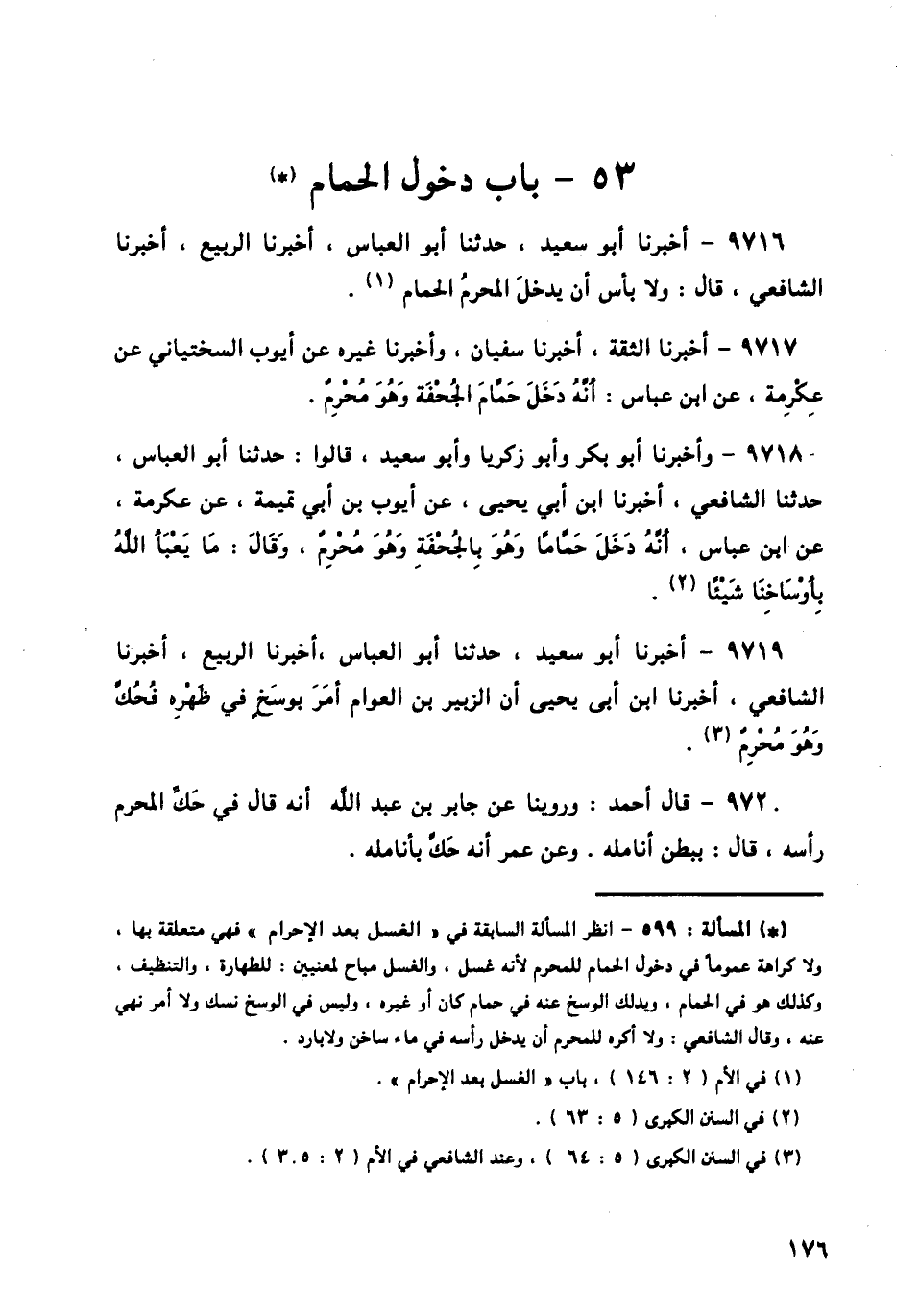 9716 - أَخْبَرَنَا أَبُو سَعِيدٍ، حَدَّثَنَا أَبُو الْعَبَّاسِ، أَخْبَرَنَا الرَّبِيعُ، أَخْبَرَنَا الشَّافِعِيُّ قَالَ: «§وَلَا بَأْسَ أَنْ يَدْخُلَ الْمُحْرِمُ الْحَمَّامَ»