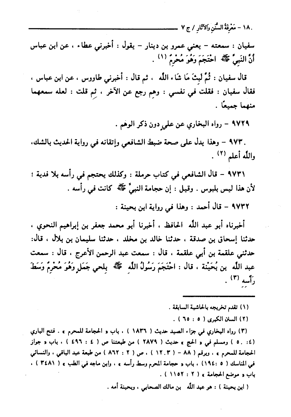 9732 - قَالَ أَحْمَدُ: وَهَذِهِ فِي رِوَايَةِ ابْنِ بُحَيْنَةَ، أَخْبَرَنَاهُ أَبُو عَبْدِ اللَّهِ الْحَافِظُ، أَخْبَرَنَا أَبُو مُحَمَّدٍ جَعْفَرُ بْنُ إِبْرَاهِيمَ النَّحْوِيُّ، حَدَّثَنَا إِسْحَاقُ بْنُ صَدَقَةَ، حَدَّثَنَا خَالِدُ بْنُ مَخْلَدٍ، حَدَّثَنَا سُلَيْمَانُ بْنُ بِلَالٍ قَالَ: حَدَّثَنِي عَلْقَمَةُ بْنُ أَبِي عَلْقَمَةَ قَالَ: سَمِعْتُ عَبْدَ الرَّحْمَنِ الْأَعْرَجَ قَالَ: سَمِعْتُ عَبْدَ اللَّهِ ابْنَ بُحَيْنَةَ قَالَ: § «احْتَجَمَ رَسُولُ اللَّهِ صَلَّى اللهُ عَلَيْهِ وَسَلَّمَ بِلَحْيِ جَمَلٍ وَهُوَ مُحْرِمٌ وَسَطَ رَأْسِهِ» -[181]- وَرَوَاهُ الْبُخَارِيُّ، عَنْ خَالِدِ بْنِ مَخْلَدٍ،