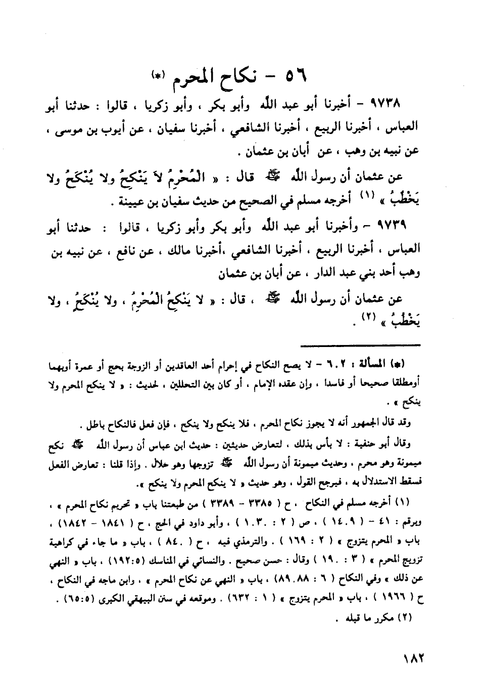 9738 - أَخْبَرَنَا أَبُو عَبْدِ اللَّهِ، وَأَبُو بَكْرٍ، وَأَبُو زَكَرِيَّا، قَالُوا: حَدَّثَنَا أَبُو الْعَبَّاسِ، أَخْبَرَنَا الرَّبِيعُ، أَخْبَرَنَا الشَّافِعِيُّ، أَخْبَرَنَا سُفْيَانُ، عَنْ أَيُّوبَ بْنِ مُوسَى، عَنْ نُبَيْهِ بْنِ وَهْبٍ، عَنْ أَبَانَ بْنِ عُثْمَانَ، عَنْ عُثْمَانَ، أَنَّ رَسُولَ اللَّهِ صَلَّى اللهُ عَلَيْهِ وَسَلَّمَ قَالَ: «§الْمُحْرِمُ لَا يَنْكِحُ وَلَا يُنْكَحُ، وَلَا يَخْطُبُ»، أَخْرَجَهُ مُسْلِمٌ فِي الصَّحِيحِ، مِنْ حَدِيثِ سُفْيَانَ بْنَ عُيَيْنَةَ
