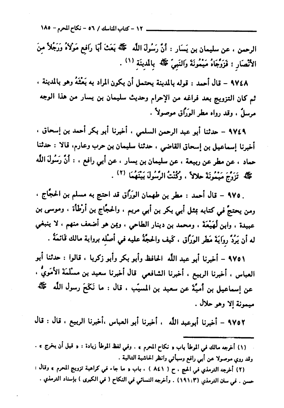 9749 - حَدَّثَنَا أَبُو عَبْدِ الرَّحْمَنِ السُّلَمِيُّ، أَخْبَرَنَا أَبُو بَكْرٍ أَحْمَدُ بْنُ إِسْحَاقَ، أَخْبَرَنَا إِسْمَاعِيلُ بْنُ إِسْحَاقَ الْقَاضِي، حَدَّثَنَا سُلَيْمَانُ بْنُ حَرْبٍ، وعَارِمٌ قَالَا: حَدَّثَنَا حَمَّادٌ، عَنْ مَطَرٍ، عَنْ رَبِيعَةَ، عَنْ سُلَيْمَانَ بْنِ يَسَارٍ، عَنْ أَبِي رَافِعٍ: أَنَّ رَسُولَ اللَّهِ صَلَّى اللهُ عَلَيْهِ وَسَلَّمَ «§تَزَوَّجَ مَيْمُونَةَ حَلَالًا، وَكُنْتُ الرَّسُولَ بَيْنَهُمَا»