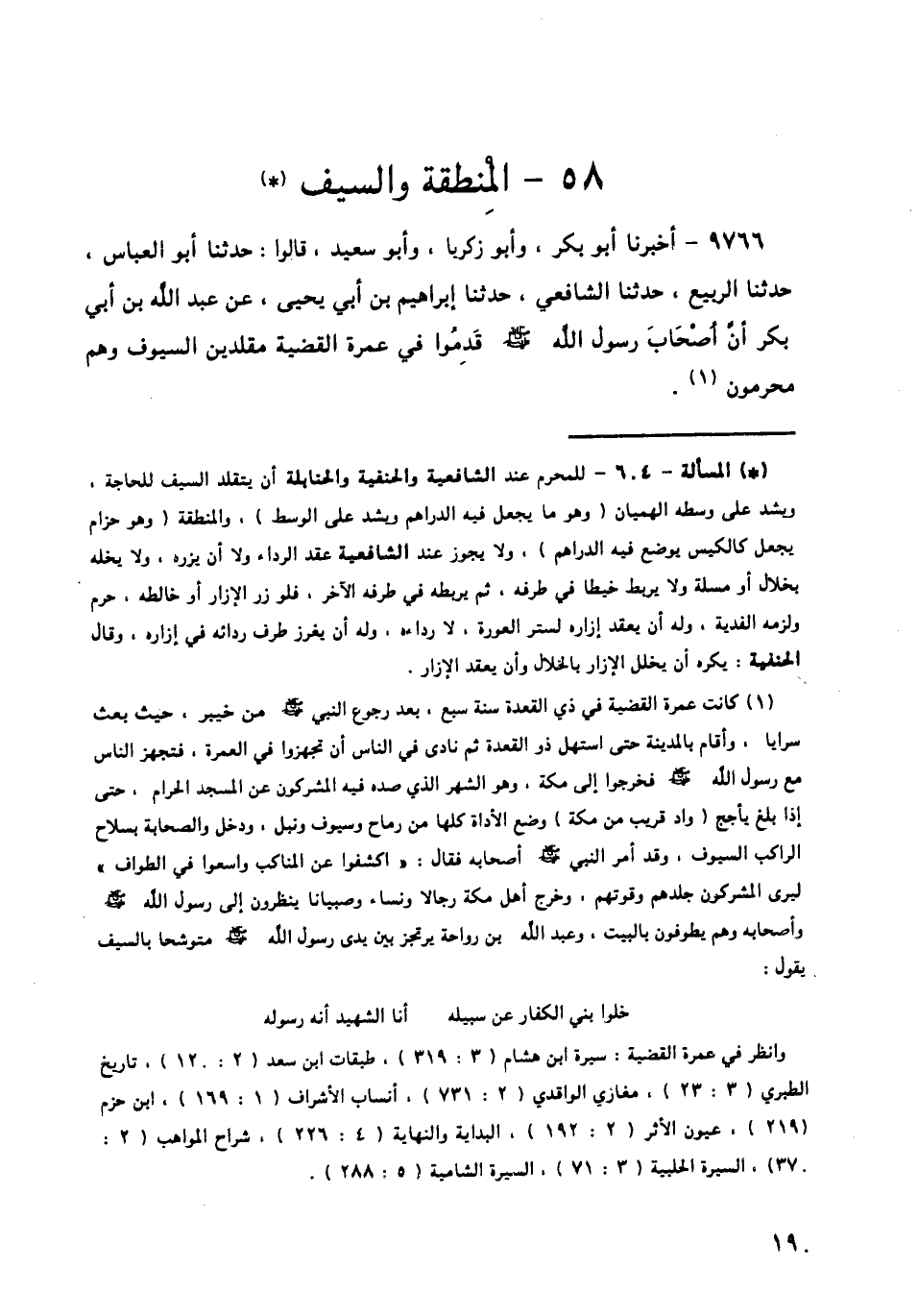 9766 - وَأَخْبَرَنَا أَبُو بَكْرٍ، وَأَبُو زَكَرِيَّا، وَأَبُو سَعِيدٍ، قَالُوا: حَدَّثَنَا أَبُو الْعَبَّاسِ: حَدَّثَنَا الرَّبِيعُ، حَدَّثَنَا الشَّافِعِيُّ، حَدَّثَنَا إِبْرَاهِيمُ بْنُ أَبِي يَحْيَى، عَنْ عَبْدِ اللَّهِ بْنِ أَبِي بَكْرٍ، أَنَّ أَصْحَابَ رَسُولِ اللَّهِ صَلَّى اللهُ عَلَيْهِ وَسَلَّمَ قَدِمُوا فِي عُمْرَةِ الْقَضِيَّةِ «§مُقَلِّدِينَ السُّيُوفِ، وَهُمْ مُحْرِمُونَ» -[191]-