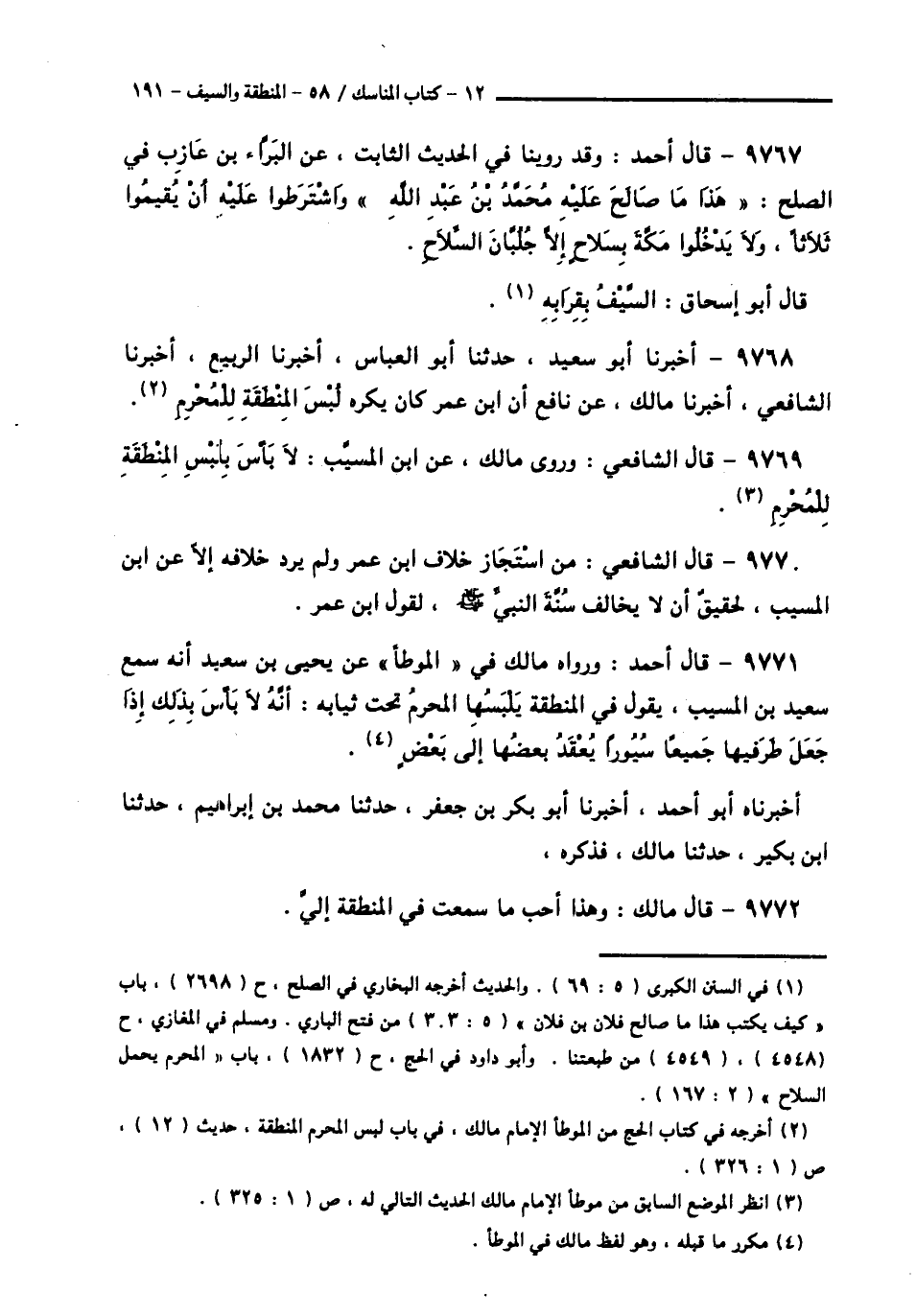 9769 - قَالَ الشَّافِعِيُّ: ورَوَى مَالِكٌ، عَنِ ابْنِ الْمُسَيِّبِ: «§لَا بَأْسَ بِلُبْسِ الْمِنْطَقَةِ لِلْمُحْرِمِ»