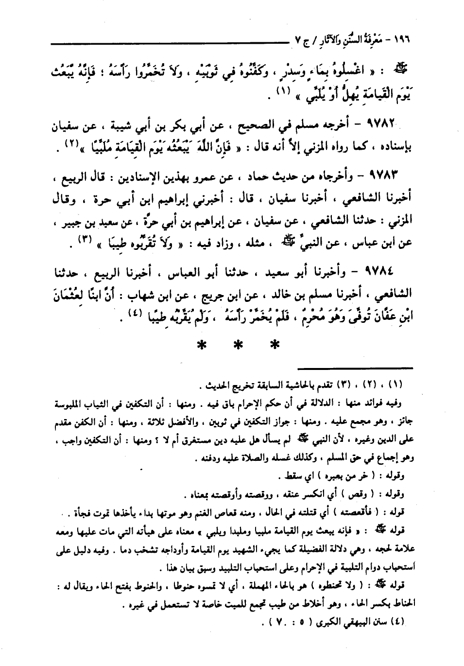 9784 - وَأَخْبَرَنَا أَبُو سَعِيدٍ، حَدَّثَنَا أَبُو الْعَبَّاسِ، أَخْبَرَنَا الرَّبِيعُ، حَدَّثَنَا الشَّافِعِيُّ، أَخْبَرَنَا مُسْلِمُ بْنُ خَالِدٍ، عَنِ ابْنِ جُرَيْجٍ، عَنِ ابْنِ شِهَابٍ: أَنَّ ابْنًا لِعُثْمَانَ بْنِ عَفَّانَ «§تُوُفِّيَ وَهُوَ مُحْرِمٌ، فَلَمْ يُخَمِّرْ رَأْسَهُ، وَلَمْ يُقَرِّبْهُ طِيبًا»