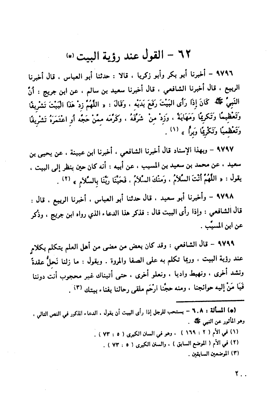 9799 - قَالَ الشَّافِعِيُّ: وَقَدْ كَانَ بَعْضُ مَنْ مَضَى مِنْ أَهْلِ الْعِلْمِ يَتَكَلَّمُ بِكَلَامٍ عِنْدَ رُؤْيَةِ الْبَيْتِ، وَرُبَّمَا تَكَلَّمَ بِهِ عَلَى الصَّفَا، وَالْمَرْوَةِ، وَيَقُولُ: مَا زِلْنَا نَحُلُّ عُقْدَةً وَنَشُدُّ أُخْرَى، وَنَهْبِطُ وَادِيًا، وَنَعْلُو أُخْرَى، حَتَّى أَتَيْنَاكَ غَيْرَ مَحْجُوبٍ أَنْتَ دُونَنَا فَيَا مَنْ إِلَيْهِ حَوَائِجُنَا، وَمِنْهُ حَجُّنَا ارْحَمْ مَلْقَى رِحَالِنَا بِفِنَاءِ بَيْتِكَ