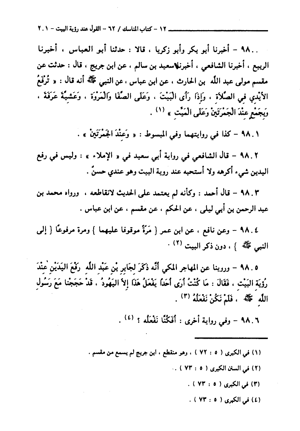 9805 - وَرُوِّينَا عَنِ الْمُهَاجِرِ الْمَكِّيِّ، أَنَّهُ ذَكَرَ لِجَابِرِ بْنِ عَبْدِ اللَّهِ رَفْعَ الْيَدَيْنِ عِنْدَ رُؤْيَةِ الْبَيْتِ، فَقَالَ: مَا كُنْتُ أَرَى أَحَدًا يَفْعَلُ هَذَا إِلَّا الْيَهُودَ، قَدْ حَجَجْنَا مَعَ رَسُولِ اللَّهِ صَلَّى اللهُ عَلَيْهِ وَسَلَّمَ، فَلَمْ نَكُنْ نَفْعَلُهُ،