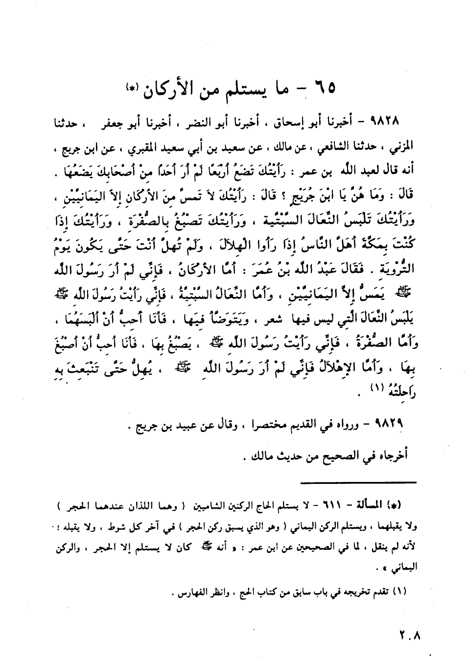 9828 - أَخْبَرَنَا أَبُو إِسْحَاقَ، أَخْبَرَنَا أَبُو النَّضْرِ، أَخْبَرَنَا أَبُو جَعْفَرٍ، حَدَّثَنَا الْمُزَنِيُّ، حَدَّثَنَا الشَّافِعِيُّ، عَنْ مَالِكٍ، عَنْ سَعِيدِ بْنِ أَبِي سَعِيدٍ الْمَقْبُرِيِّ، عَنِ ابْنِ جُرَيْجٍ، أَنَّهُ قَالَ لِعَبْدِ اللَّهِ بْنِ عُمَرَ: رَأَيْتُكَ تَضَعُ أَرْبَعًا لَمْ أَرَ أَحَدًا مِنْ أَصْحَابِكَ يَضَعُهَا قَالَ: وَمَا هُنَّ يَا ابْنَ جُرَيْجٍ؟ قَالَ: رَأَيْتُكَ لَا تَمَسُّ مِنَ الْأَرْكَانِ إِلَّا الْيَمَانِيَّيْنِ، وَرَأَيْتُكَ تَلْبَسُ النِّعَالَ السَّبْتِيَّةَ، وَرَأَيْتُكَ تَصْبُغُ بِالصُّفْرَةِ، وَرَأَيْتُكَ إِذَا كُنْتَ بِمَكَّةَ، أَهَلَّ النَّاسُ، إِذَا رَأَوَا الْهِلَالَ، وَلَمْ تُهِلَّ أَنْتَ حَتَّى يَكُونَ يَوْمُ التَّرْوِيَةِ. فَقَالَ عَبْدُ اللَّهِ بْنُ عُمَرَ: أَمَّا الْأَرْكَانُ، فَإِنِّي لَمْ أَرَ رَسُولَ اللَّهِ صَلَّى اللهُ عَلَيْهِ وَسَلَّمَ يَمَسُّ إِلَّا الْيَمَانِيَّيْنِ، وَأَمَّا النِّعَالُ السَّبْتِيَّةُ، فَإِنِّي رَأَيْتُ رَسُولَ اللَّهِ صَلَّى اللهُ عَلَيْهِ وَسَلَّمَ «§يَلْبَسُ النِّعَالَ الَّتِي لَيْسَ فِيهَا شَعْرٌ، وَيَتَوَضَّأُ فِيهَا، فَأَنَا أُحِبُّ أَنْ أَلْبَسَهُمَا، وَأَمَّا الصُّفْرَةُ، فَإِنِّي رَأَيْتُ رَسُولَ اللَّهِ صَلَّى اللهُ عَلَيْهِ وَسَلَّمَ، يَصْبُغُ بِهَا، فَأَنَا أُحِبُّ أَنْ أَصْبُغَ بِهَا، وَأَمَّا الْإِهْلَالُ فَإِنِّي لَمْ أَرَ رَسُولَ اللَّهِ صَلَّى اللهُ عَلَيْهِ وَسَلَّمَ، يُهِلُّ حَتَّى تَنْبَعِثَ بِهِ رَاحِلَتُهُ»