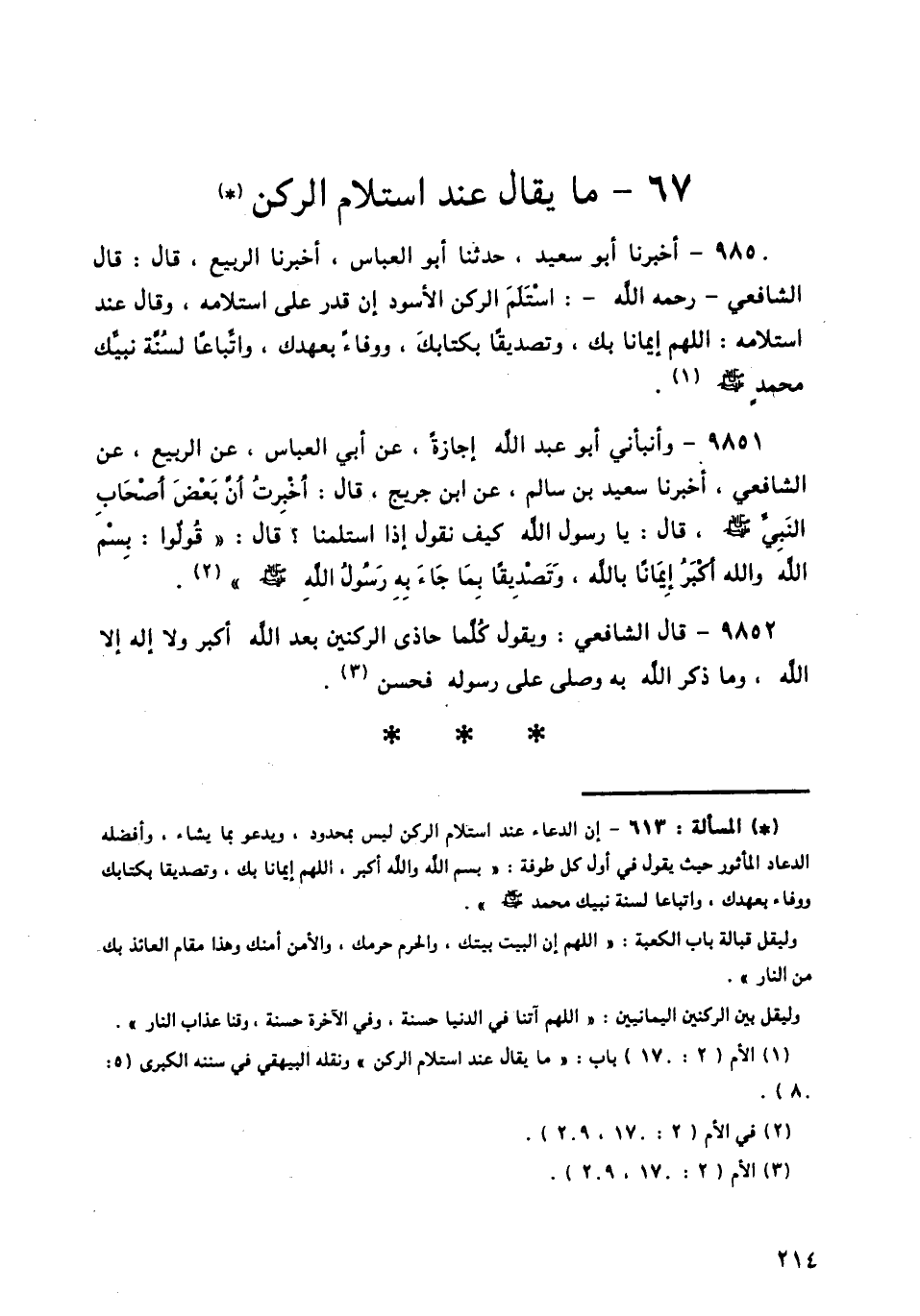 9850 - أَخْبَرَنَا أَبُو سَعِيدٍ، حَدَّثَنَا أَبُو الْعَبَّاسِ، أَخْبَرَنَا الرَّبِيعُ قَالَ: قَالَ الشَّافِعِيُّ رَحِمَهُ اللَّهُ: اسْتَلَمَ الرُّكْنَ الْأَسْوَدَ إِنْ قَدَرَ عَلَى اسْتِلَامِهِ، وَقَالَ عِنْدَ اسْتِلَامِهِ: «§اللَّهُمَّ إِيمَانًا بِكَ، وَتَصْدِيقًا بِكِتَابِكَ، وَوَفَاءً بِعَهْدِكَ، وَاتِّبَاعًا لِسُنَّةِ نَبِيِّكَ مُحَمَّدٍ صَلَّى اللهُ عَلَيْهِ وَسَلَّمَ»