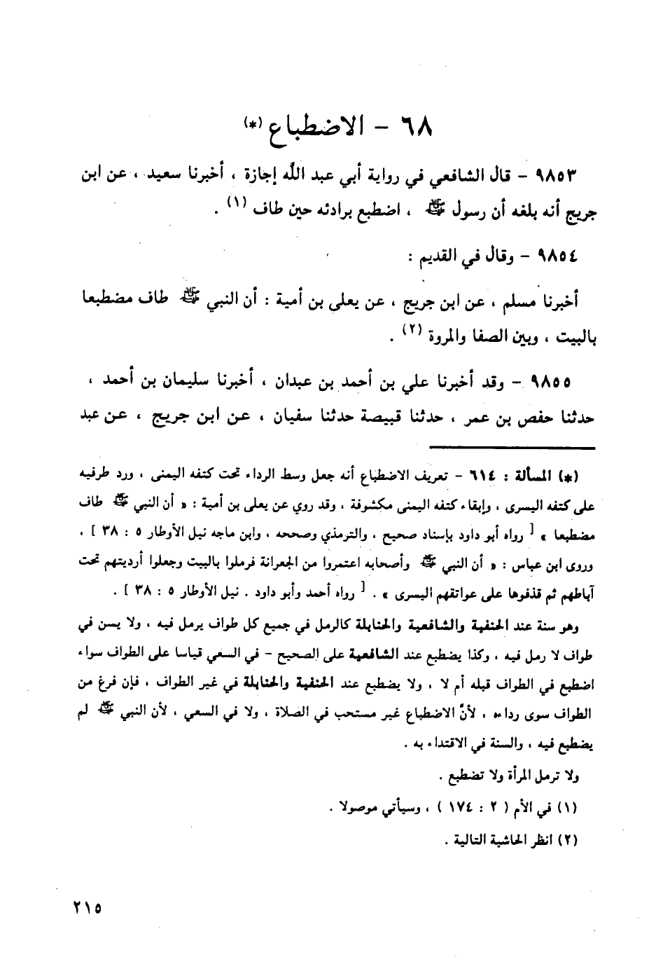 9853 - قَالَ الشَّافِعِيُّ فِي رِوَايَةِ أَبِي عَبْدِ اللَّهِ إِجَازَةً، أَخْبَرَنَا سَعِيدٌ، عَنِ ابْنِ جُرَيْجٍ، أَنَّهُ بَلَغَهُ أَنَّ رَسُولَ اللَّهِ صَلَّى اللهُ عَلَيْهِ وَسَلَّمَ، " اضْطَبَعَ بِرِدَائِهِ حِينَ طَافَ