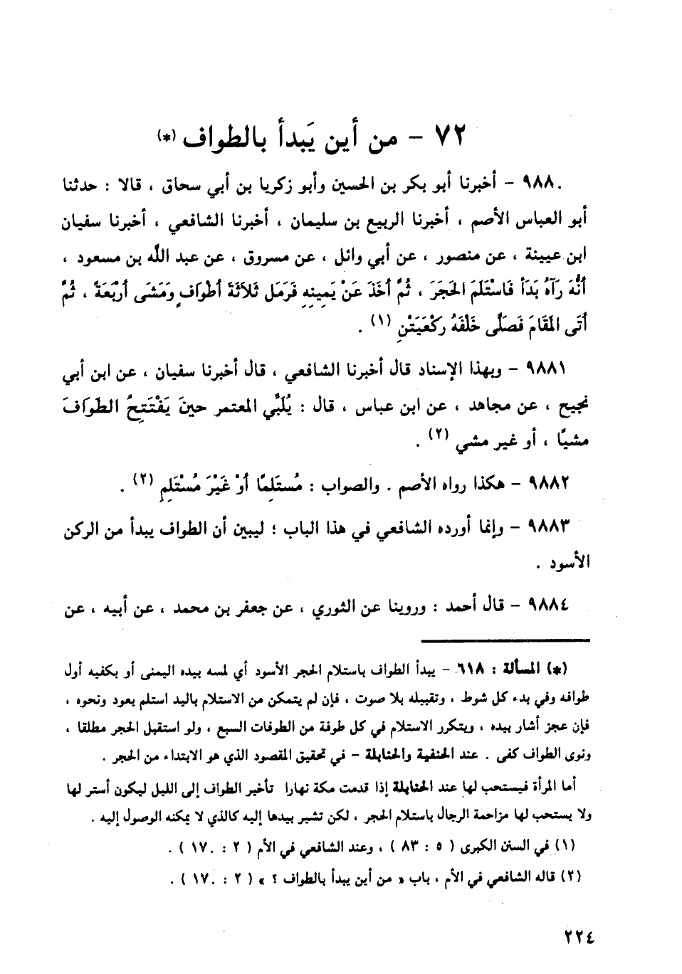 9880 - أَخْبَرَنَا أَبُو بَكْرِ بْنُ الْحُسَيْنِ، وَأَبُو زَكَرِيَّا بْنُ أَبِي إِسْحَاقَ قَالَا: حَدَّثَنَا أَبُو الْعَبَّاسِ الْأَصَمُّ، أَخْبَرَنَا الرَّبِيعُ بْنُ سُلَيْمَانَ، أَخْبَرَنَا الشَّافِعِيُّ، أَخْبَرَنَا سُفْيَانُ بْنُ عُيَيْنَةَ، عَنْ مَنْصُورٍ، عَنْ أَبِي وَائِلٍ، عَنْ مَسْرُوقٍ، عَنْ عَبْدِ اللَّهِ بْنِ مَسْعُودٍ، أَنَّهُ «§رَآهُ بَدَأَ فَاسْتَلَمَ الْحَجَرَ، ثُمَّ أَخَذَ عَنْ يَمِينِهِ فَرَمَلَ ثَلَاثَةَ أَطْوَافٍ، وَمَشَى أَرْبَعَةً، ثُمَّ أَتَى الْمَقَامَ، فَصَلَّى خَلْفَهُ رَكْعَتَيْنِ»