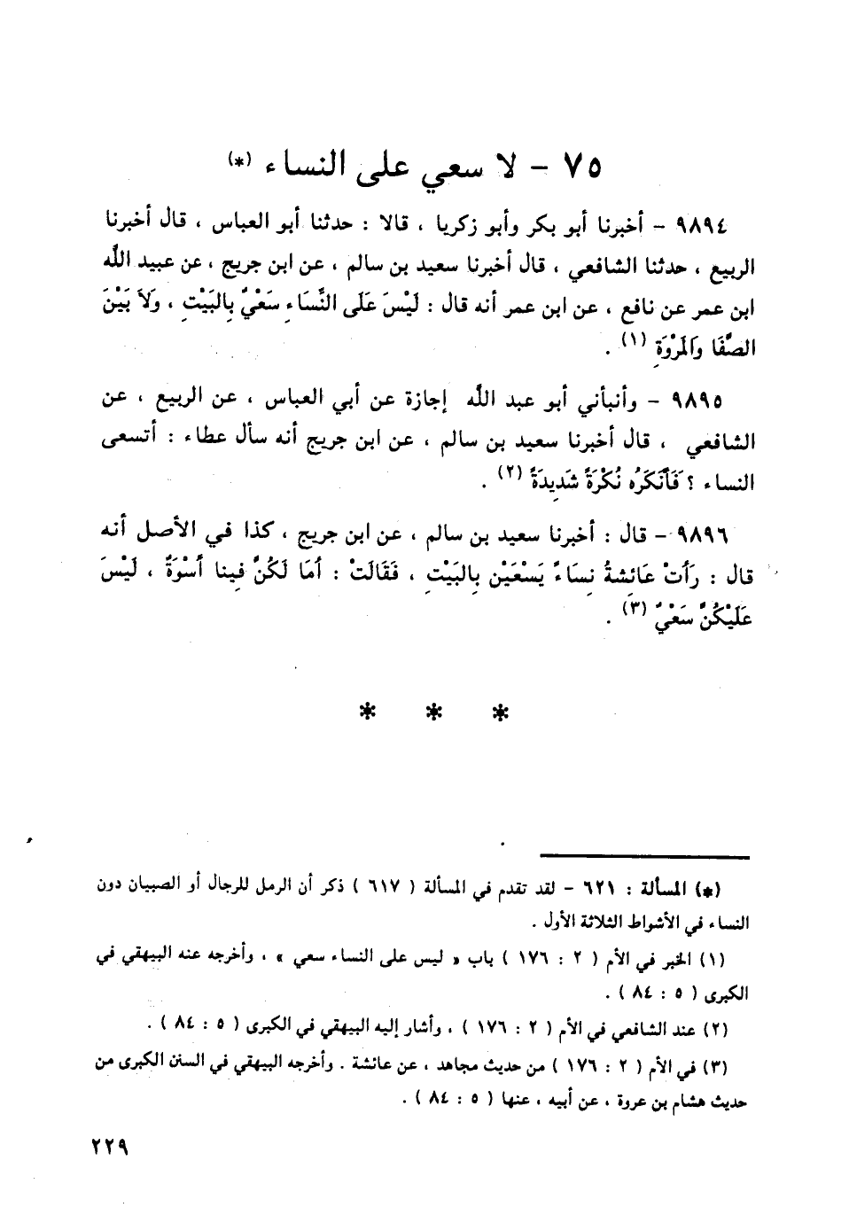 9894 - أَخْبَرَنَا أَبُو بَكْرٍ، وَأَبُو زَكَرِيَّا قَالَا: حَدَّثَنَا أَبُو الْعَبَّاسِ، قَالَ أَخْبَرَنَا الرَّبِيعُ، حَدَّثَنَا الشَّافِعِيُّ قَالَ: أَخْبَرَنَا سَعِيدُ بْنُ سَالِمٍ، عَنِ ابْنِ جُرَيْجٍ، عَنْ عُبَيْدِ اللَّهِ بْنِ عُمَرَ، عَنْ نَافِعٍ، عَنِ ابْنِ عُمَرَ، أَنَّهُ قَالَ: «§لَيْسَ عَلَى النِّسَاءِ سَعْيٌ بِالْبَيْتِ، وَلَا بَيْنَ الصَّفَا، وَالْمَرْوَةِ»