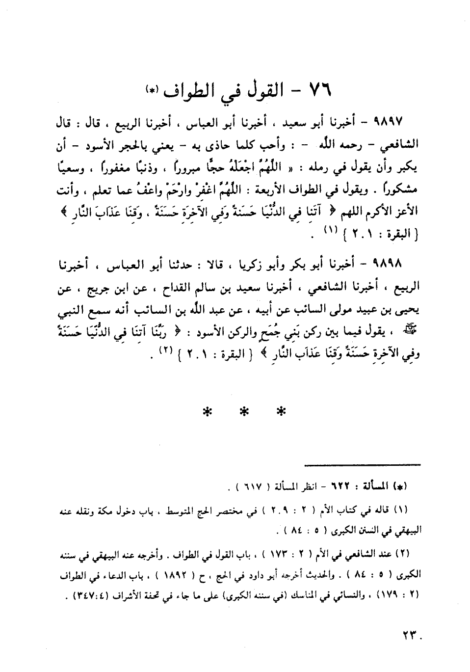 9897 - أَخْبَرَنَا أَبُو سَعِيدٍ، أَخْبَرَنَا أَبُو الْعَبَّاسِ، أَخْبَرَنَا الرَّبِيعُ قَالَ: قَالَ الشَّافِعِيُّ رَحِمَهُ اللَّهُ: وَأُحِبُّ كُلَّمَا حَاذَى بِهِ يَعْنِي بِالْحَجَرِ الْأَسْوَدِ أَنْ يُكَبِّرَ وَأَنْ يَقُولَ فِي رَمَلِهِ: اللَّهُمَّ " §اجْعَلْهُ حَجًّا مَبْرُورًا، وَذَنْبًا مَغْفُورًا، وَسَعْيًا مَشْكُورًا. وَيَقُولُ فِي الطَّوَافِ الْأَرْبَعَةِ: اللَّهُمَّ اغْفِرْ وَارْحَمْ وَاعْفُ عَمَّا تَعْلَمُ، وَأَنْتَ الْأَعَزُّ الْأَكْرَمُ اللَّهُمَّ {آتِنَا فِي الدُّنْيَا حَسَنَةً وَفِي الْآخِرَةِ حَسَنَةً، وَقِنَا عَذَابَ النَّارِ} [البقرة: 201] "