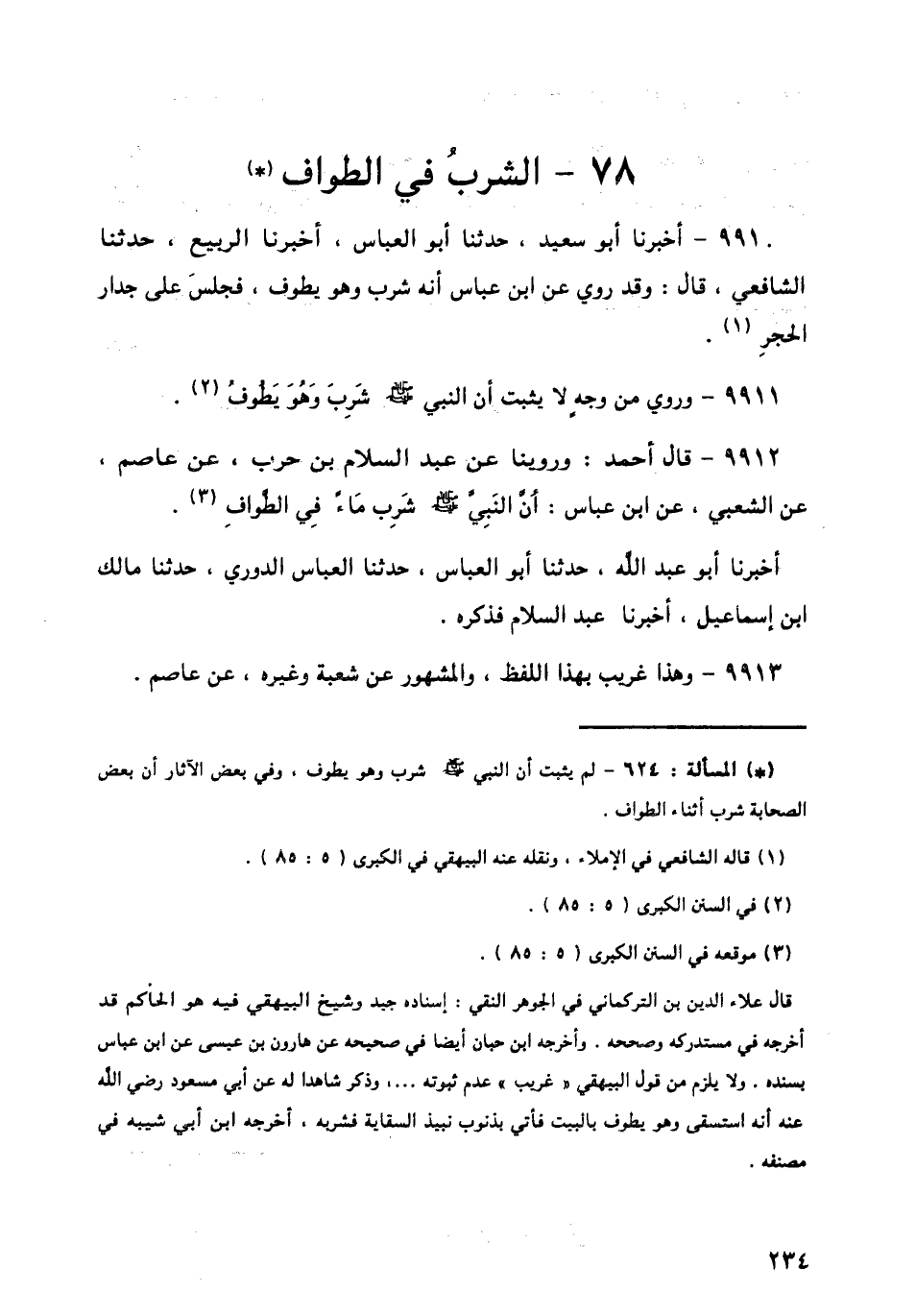 9910 - أَخْبَرَنَا أَبُو سَعِيدٍ، حَدَّثَنَا أَبُو الْعَبَّاسِ، أَخْبَرَنَا الرَّبِيعُ، حَدَّثَنَا الشَّافِعِيُّ قَالَ: وَقَدْ رُوِيَ عَنِ ابْنِ عَبَّاسٍ: أَنَّهُ «§شَرِبَ وَهُوَ يَطُوفُ، فَجَلَسَ عَلَى جِدَارِ الْحَجَرِ»،
